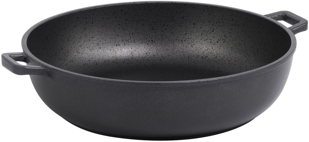 Patelnia wykonana jest z odlewanego pod ciśnieniem – ekstremalnie trwałego - aluminium. Grubość korpusu rondla ok. 7 mm sprawia, że powłoka nieprzywierająca jest dobrze chroniona. Dzięki grubemu korpusowi patelnia doskonale radzi sobie z deformacją, uderzeniami i nagłymi zmianami temperatury. Najwyższej jakości powłoka PTFE (politetrafluoroetylen) nanoszona jest bezpośrednio na odlewanym aluminium, co sprawia, że jest bardziej odporna niż w przypadku powłoki nakładanej warstwowo. Jej wyjątkowa odporność na ścieranie sprawia, że patelnia zachowuje swoje właściwości non-stick aż o 50% dłużej niż inne patelnie tego typu, co czyni ją ekonomicznym wyborem. Powłoka non-stick nie zawiera szkodliwych dla zdrowia związków chemicznych PFOS (kwas perfluorooktanosulfonowy) oraz PFOA (kwas perfluorooktanowy), i pokrywa zarówno wewnętrzną, jak i zewnętrzną stronę naczynia. Dzięki wysokiej jakości powłoce nieprzywierającej możesz przygotowywać zdrowe dania z minimalną ilością tłuszczu. Dwa wygodne uchwyty odlane w masie (bez nitowania) zapewniają pewny chwyt i wygodę podczas przenoszenia naczynia.