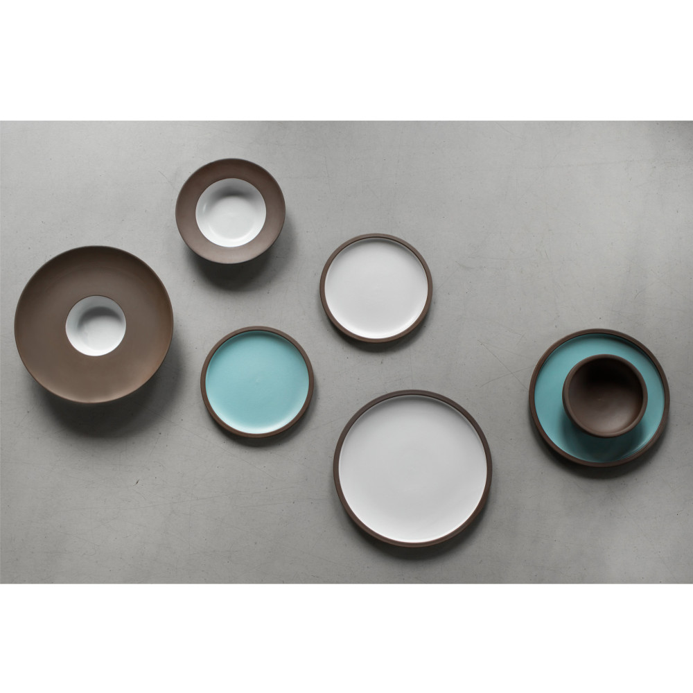 Kolekcja porcelany CHOCO marki Verlo to wyjątkowe połączenie pięknego szafirowego błękitu i delikatnej waniliowej bieli, które harmonizują z matowym, czekoladowym brązem zewnętrznej części naczyń. Mocno zarysowany, płaski rant naczyń w tym samym kolorze brązu wspaniale podkreśla wewnętrzne barwy kolekcji.