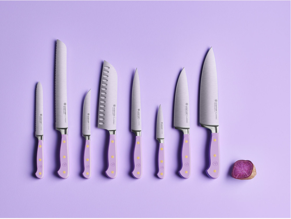CLASSIC COLOR marki WÜSTHOF to kolekcja odnosząca się do skojarzeń pochodzących ze świata kulinarnego, zainspirowana oddziaływaniem kolorów na nasze emocje. Choć doświadczanie kolorów jest w dużej mierze subiektywne, oczywiste jest że mogą one wpływać na szeroki wachlarz naszych nastrojów, uczuć czy wspomnień. Kolor może być magnetyczny i inspirujący, i to jest powód, dla którego WÜSTHOF z radością i dumą rozszerza serię noży Classic. Pięć pięknych odcieni z pewnością wywoła dobre skojarzenia i dodadzą subtelnego akcentu kolorystycznego do Twojego kulinarnego życia. Poznaj inspirujące kolory: AKSAMITNA OSTRYGA, FIOLETOWY YAM, KORALOWA BRZOSKWINIA, RÓŻOWA SÓL HIMALAJSKA, AROMATYCZNY SUMAK i ciesz się chwilami pełnymi energetyzującej energii.
