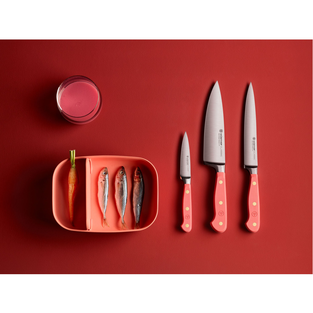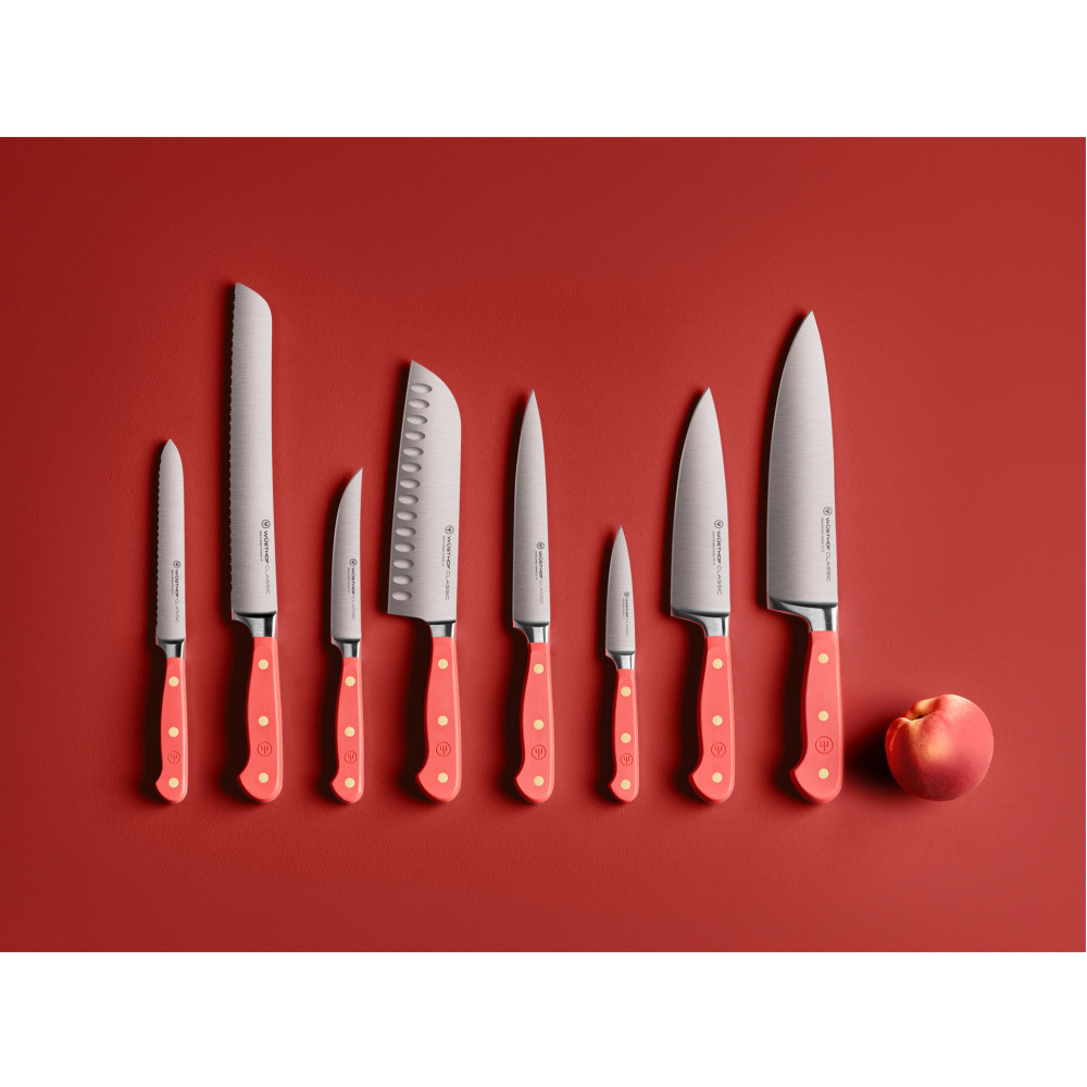 CLASSIC COLOR marki WÜSTHOF to kolekcja odnosząca się do skojarzeń pochodzących ze świata kulinarnego, zainspirowana oddziaływaniem kolorów na nasze emocje. Choć doświadczanie kolorów jest w dużej mierze subiektywne, oczywiste jest że mogą one wpływać na szeroki wachlarz naszych nastrojów, uczuć czy wspomnień. Kolor może być magnetyczny i inspirujący, i to jest powód, dla którego WÜSTHOF z radością i dumą rozszerza serię noży Classic. Pięć pięknych odcieni z pewnością wywoła dobre skojarzenia i dodadzą subtelnego akcentu kolorystycznego do Twojego kulinarnego życia. Poznaj inspirujące kolory: AKSAMITNA OSTRYGA, FIOLETOWY YAM, KORALOWA BRZOSKWINIA, RÓŻOWA SÓL HIMALAJSKA, AROMATYCZNY SUMAK i ciesz się chwilami pełnymi energetyzującej energii.