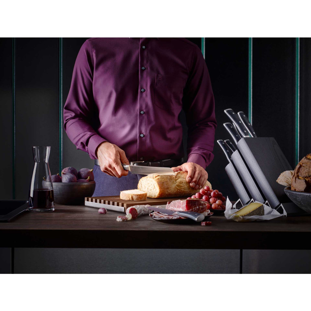 Nóż do chleba dedykowany jest do krojenia wszelkiego rodzaju pieczywa świeżego i chrupkiego. Dzięki ząbkowanemu ostrzu uzyskujemy kromki o pożądanej grubości bez konieczności ściskania pieczywa. Sprawdzi się również podczas porcjowania ciast i tortów.