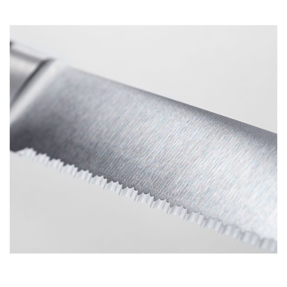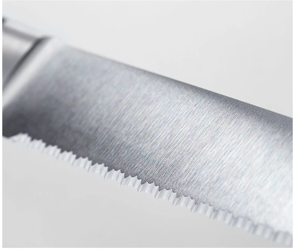 Precyzyjna, podwójnie ząbkowana krawędź noża do chleba WÜSTHOF sprawia znaczną różnicę w stosunku do standardowego noża do chleba: w przeciwieństwie do jednokrotnie ząbkowanej krawędzi, ten nóż posiada podwójne ząbki, co oznacza, że pozostaje ostry dłużej, wymaga mniejszego nacisku i nadaje się do bardzo precyzyjnych cięć. Chleb o twardej skórce nie jest miażdżony podczas krojenia, natomiast chleb o miękkiej skórce jest również precyzyjnie krojony, bez rozrywania delikatnej powierzchni pieczywa.