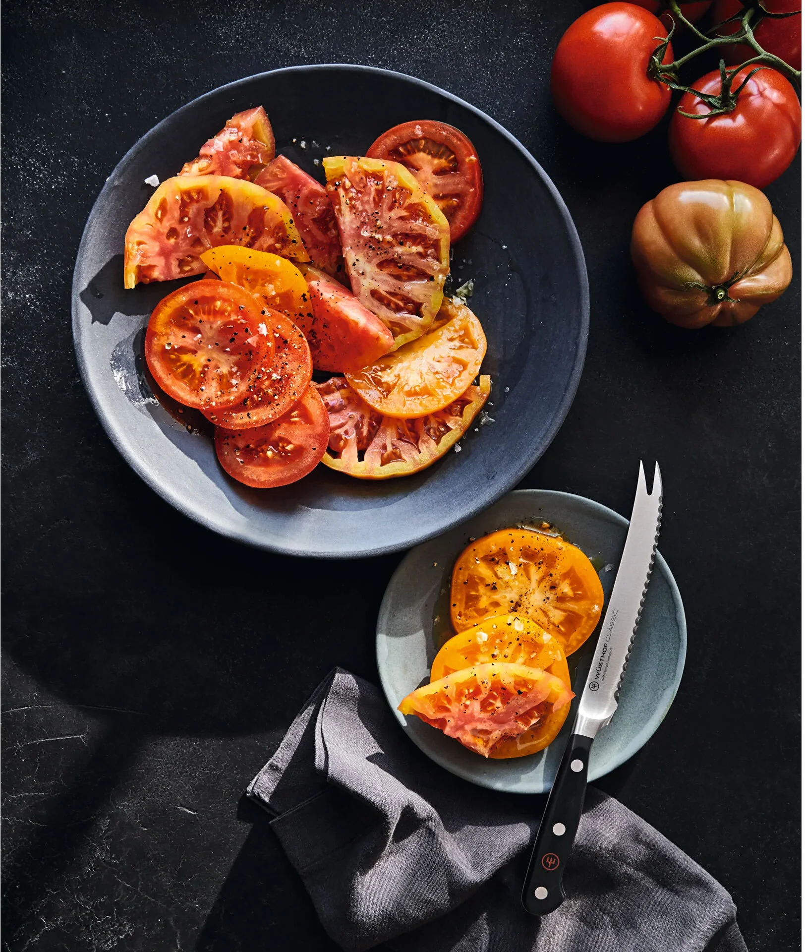 Nóż o ząbkowanym ostrzu pokroi nawet najbardziej dojrzałe pomidory w idealnie cienkie plasterki. Specjalnie wyprofilowana końcówka noża jest doskonałym narzędziem do serwowania pokrojonych plasterków czy cząstek.
