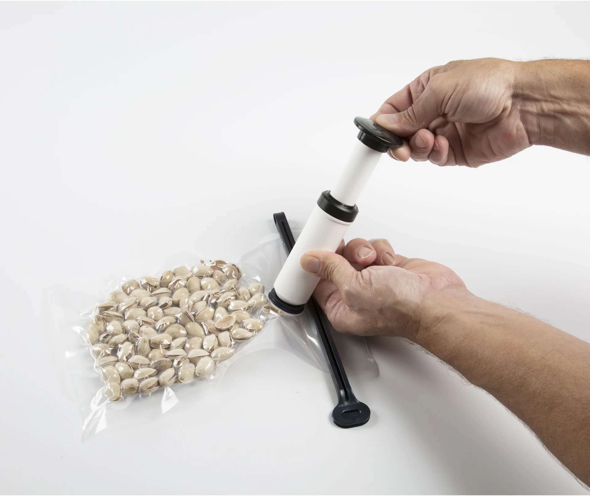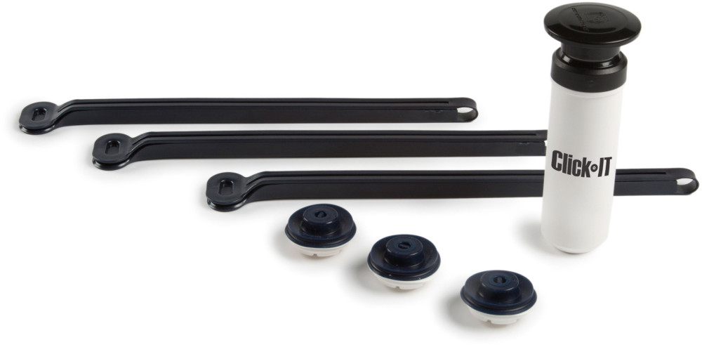 CLICK IT to łatwy w obsłudze zestaw do próżniowego pakowania. W kilka sekund, bez użycia specjalistycznego urządzenia, za pomocą pompki zapakujesz próżniowo wybrane produkty. Ergonomiczna i kompaktowa pompka oraz torebki foliowe wraz ze specjalnymi zaworami umożliwiają usuwanie powietrza i tworzenie próżni.