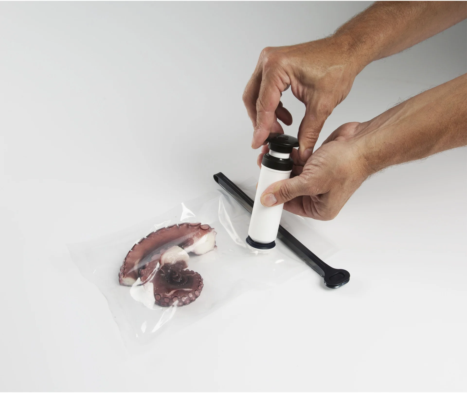 Przenośny zestaw wielokrotnego użytku, o niewielkich rozmiarach, jest bardzo wygodny w przechowywaniu. Dzięki niemu zachowasz świeżość ziaren, nasion, kawy, zapobiegając ich jełczeniu. Umożliwia także marynowanie oraz uzyskanie idealnie przygotowanego mięsa i ryb podczas gotowania sous-vide. Worki do pakowania próżniowego są przetestowane pod kątem wytrzymałości i są odporne na temperatury od -40°C do 100°C. Zestaw zawiera: ręczną pompkę do pakowania próżniowego, 2 klipsy, 3 zawory oraz 3 worki do pakowania próżniowego.