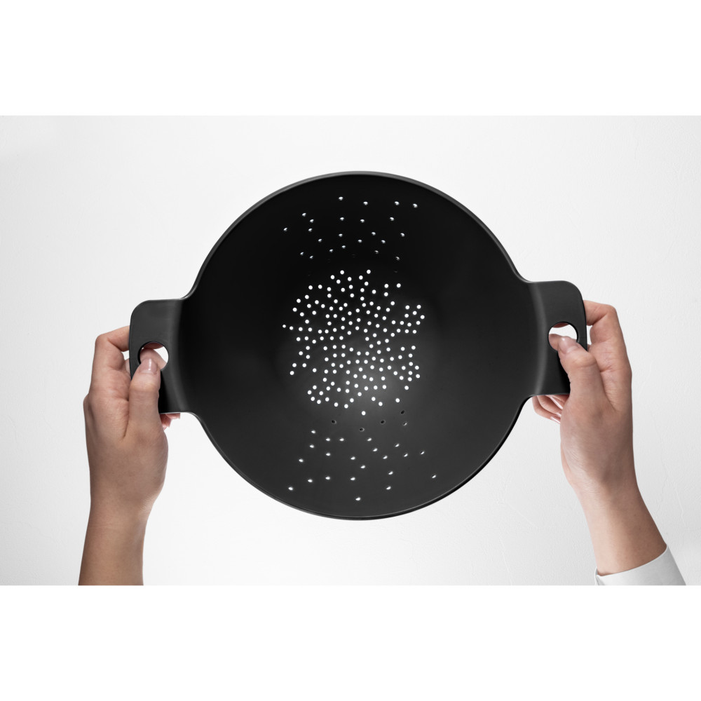 Durszlak COSMO Blim Plus został zaprojektowany z uwzględnieniem nietypowego rozmieszczenia otworów, które pozwalają w najlepszy możliwy sposób odsączyć makaron. Średnica otworów jest mniejsza od wewnątrz a szersza po zewnętrznej stronie durszlaka. Dzięki temu odsączana woda nie bryzga na boki, a co najważniejsze, spaghetti nie wydostaje się przez otwory na zewnątrz durszlaka . Jest pojemny i posiada stabilną podstawę z czterema podpierającymi nóżkami . Brak wewnętrznych otworów po stronach z uchwytami chroni dłonie przed wodą lub parą, a wygodne trzony z otworami na palec pozwalają sprawnie i bezpiecznie go przenieś.