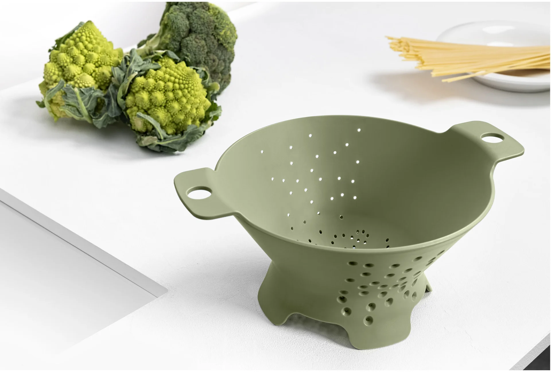 Durszlak COSMO Blim Plus został zaprojektowany z uwzględnieniem nietypowego rozmieszczenia otworów, które pozwalają w najlepszy możliwy sposób odsączyć makaron. Średnica otworów jest mniejsza od wewnątrz a szersza po zewnętrznej stronie durszlaka. Dzięki temu odsączana woda nie bryzga na boki, a co najważniejsze, spaghetti nie wydostaje się przez otwory na zewnątrz durszlaka . Jest pojemny i posiada stabilną podstawę z czterema podpierającymi nóżkami . Brak wewnętrznych otworów po stronach z uchwytami chroni dłonie przed wodą lub parą, a wygodne trzony z otworami na palec pozwalają sprawnie i bezpiecznie go przenieś.