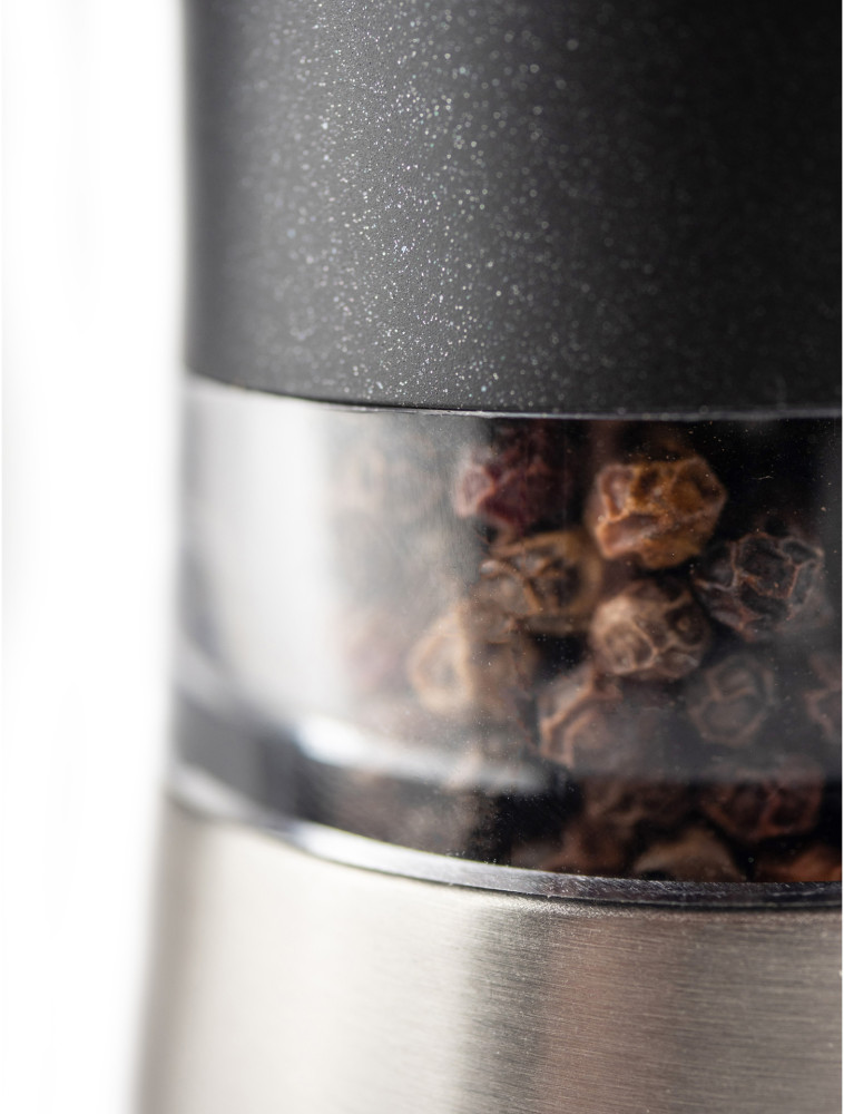 Młynek DAMAN ELECTRIC to synonim precyzji i nowoczesności. Solidna, stalowa podstawa młynka w połączeniu z delikatnością drewna i przezroczystością akrylu, to doskonałe designerskie połączenie różnych materiałów i faktur. Smukła linia i ergonomiczny kształt sprawiają, że wygodnie trzyma się go w dłoni. Doskonale uwidoczniona przyprawa wewnątrz młynka, to dodatkowy element, który uatrakcyjni aranżację stołu lub kuchni. Przezroczystość młynka pozwala na szybką i łatwą ocenę jego zawartości, a w razie potrzeby, uzupełnienie przypraw. Magnetyczne wieczko ze stali nierdzewnej ułatwia otwieranie młynka i napełnianie go przyprawami. Aby uruchomić mielenie przyprawy, wystarczy lekko docisnąć palcem wieczko. Bardzo przydatną funkcją jest podświetlenie w trakcie mielenia, które uruchamia się wraz z naciśnięciem wieczka młynka. W łatwy sposób możesz kontrolować ilość zmielonej przyprawy. Wybór grubości mielenia przyprawy odbywa się poprzez przekręcenie dolnej części korpusu.