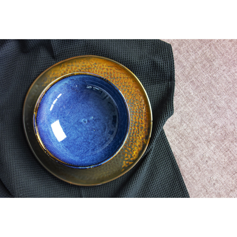 Połączenie głębi koloru z efektami nakrapiania czy też jego przenikania, uzyskano podczas wypalania porcelany nowatorską metodą. To idealna baza do wyeksponowania dań. Wysoki połysk glazury dodatkowo pięknie uwydatnia kolor. Taki efekt, z pewnością doda wnętrzu pozytywnego, mocnego akcentu.