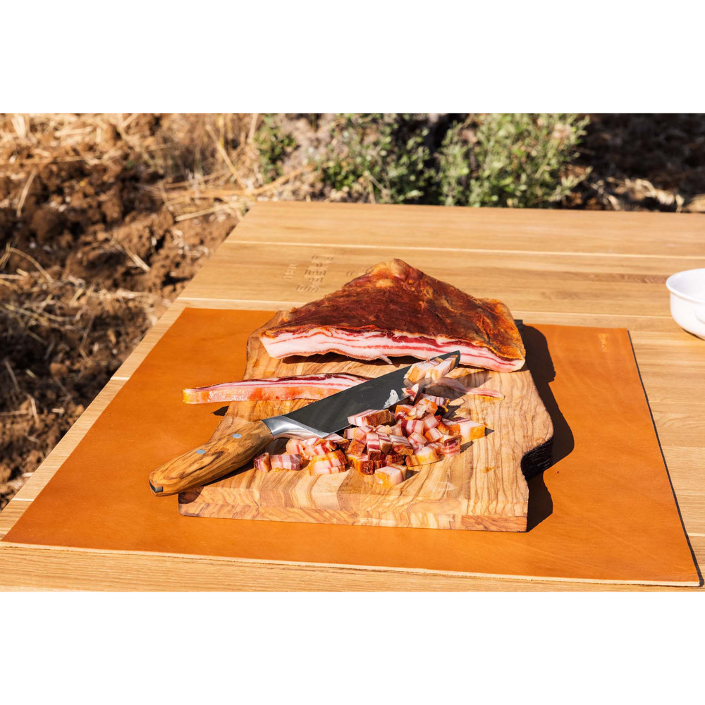 Deska do krojenia wykonana została z drewna oliwnego i zaprojektowana jako uniwersalne akcesorium przydatne przy przygotowaniu każdego rodzaju posiłku. Piękno drewna podkreślone naturalnymi krawędziami sprawia, że deska równie dobrze nadaje się nie tylko do krojenia ale i do prezentacji potraw.