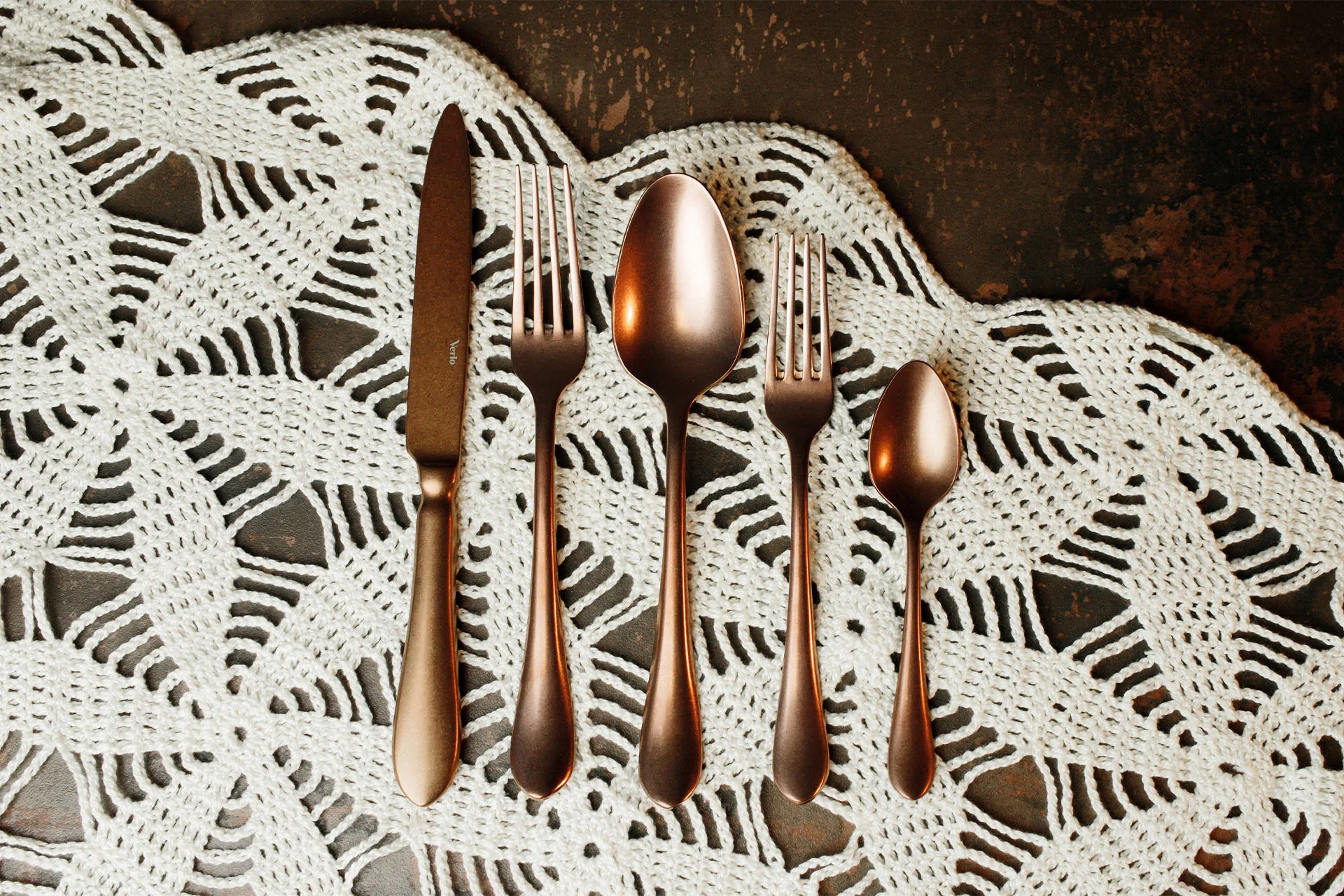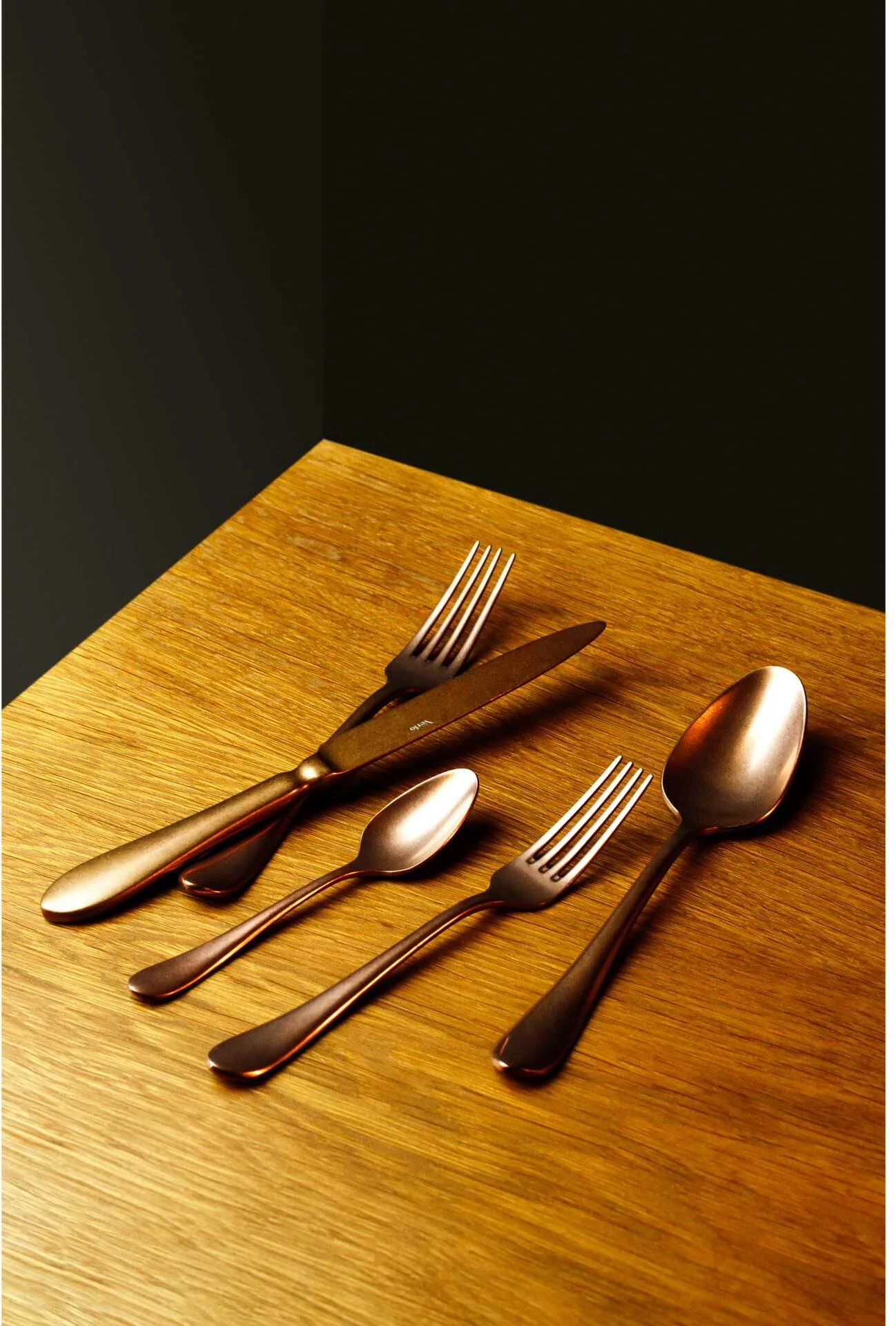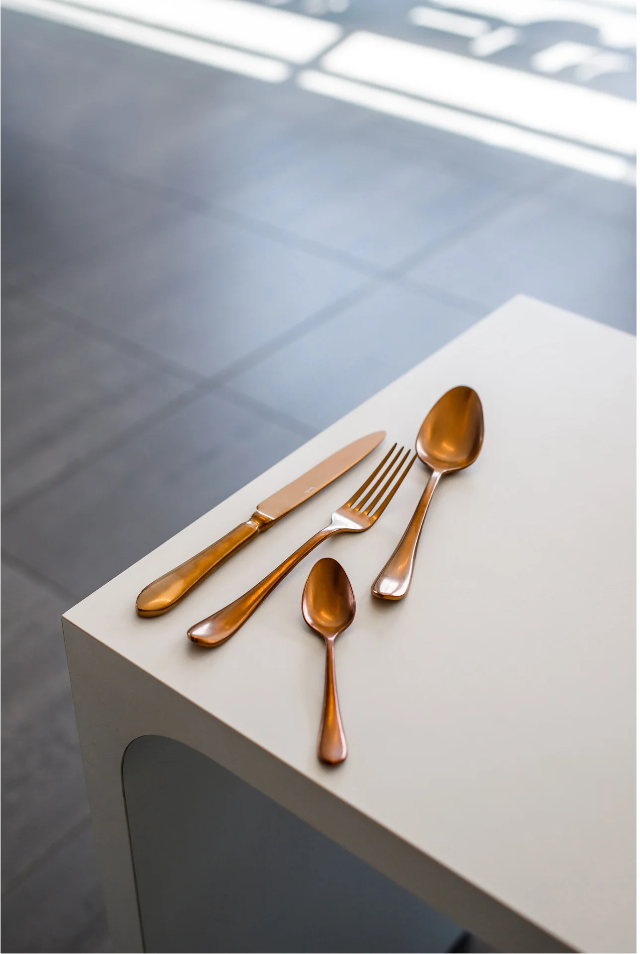 Kolekcja DESTELLO COPPER to odrobina modnego szaleństwa w nawiązaniu do jadalnianych kreacji w stylu francuskim. Opływowe, masywne rękojeści o eleganckiej linii podkreślają ten styl. Unikatowe żłobienie w górnej części uchwytu podbija efekty wizualne tej kolekcji. Szerokie łyżki subtelnie zwężające się ku górze, są nawiązaniem do tradycyjnego stylu. To również doskonały wybór do kuchni w stylu rustykalnym.