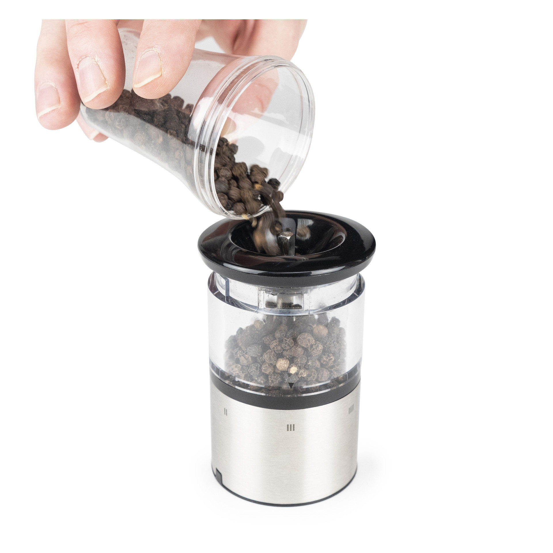 Zestaw Elis Sense Duo jest stworzony dla miłośników technologii i pięknych, użytecznych przedmiotów. Połączenie stali i akrylu to idealny duet podkreślający minimalistyczny design. Wydajne, ciche, szybkie i precyzyjne młynki Elis Sense uruchamiają się po jednoczesnym dotknięciu korpusu i wieczka młynka. Podświetlenie LED umiejscowione na spodzie jest niezwykle przydatne i sprawia, że z łatwością i precyzją dozować będziesz przyprawy. Niezwykle przydatne przy doprawianiu potraw w trakcie gotowania. Wystarczy jedna ręka, aby uruchomić młynek i doprawić danie, podczas gdy druga pozostaje wolna do przytrzymania naczynia czy zamieszania potrawy. Zestaw zawiera dodatkowe pojemniki z przyprawą, które posłużą również jako miarka oraz lejek ułatwiający uzupełnianie przyprawy.