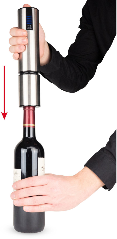Zapomnij o pokruszonych korkach! Jedyne co musisz zrobić to nałożyć korkociąg Elis Touch na szyjkę butelki i nacisnąć przycisk. Korkociąg wyposażony w mocny i cichy silnik, oraz wskaźnik LED poziomu naładowania baterii - jest zawsze gotowy do użycia. W pełni naładowana bateria wystarcza do otwarcia 80 butelek. Dodatkowo w zestawie znajduje się przecinak do folii. Zestaw Elis Touch zapakowany w eleganckim opakowaniu będzie doceniony przez każdego miłośnika wina.