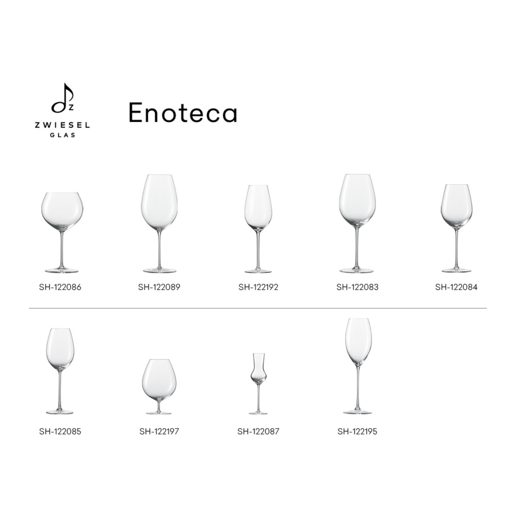 ZWIESEL HANDMADE ENOTECA jest przykładem klasycznie eleganckiego, wysmakowanego szkła. Kieliszki stworzone aby oddawać najdrobniejsze niuanse barwy wina. Jednocześnie precyzyjna specyfikacja grubości ścianek pozwala utrzymać właściwą temperaturę i sprzyjać powolnemu delektowaniu się. Szkło linii ENOTECA jest najlepszym orężem dla konesera aby wydobyć z każdego rodzaju wina pełnię barw i aromatów.
