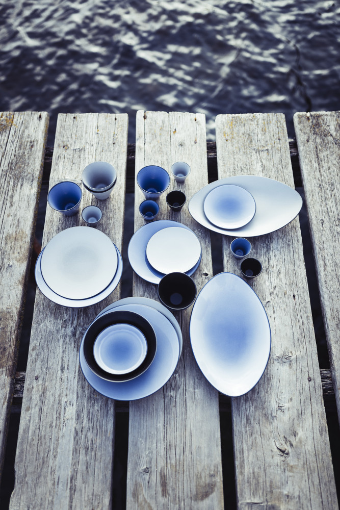 W wersji błękitno-białej dominujące błękit i biel współgrając sprawiają wrażenie jedwabistego woalu pokrywającego porcelanę. Jednocześnie czarny otok talerzy czy mis dodatkowo przykuwa naszą uwagę.