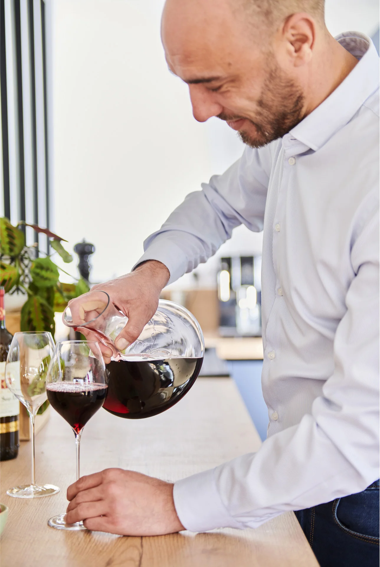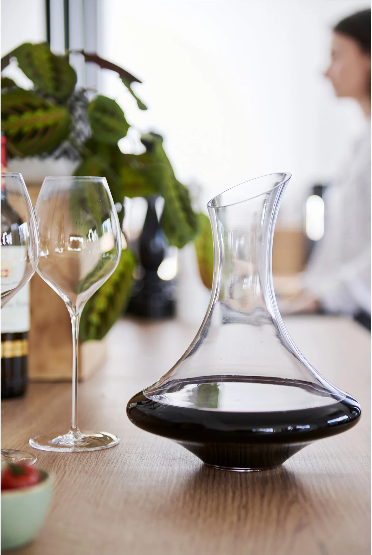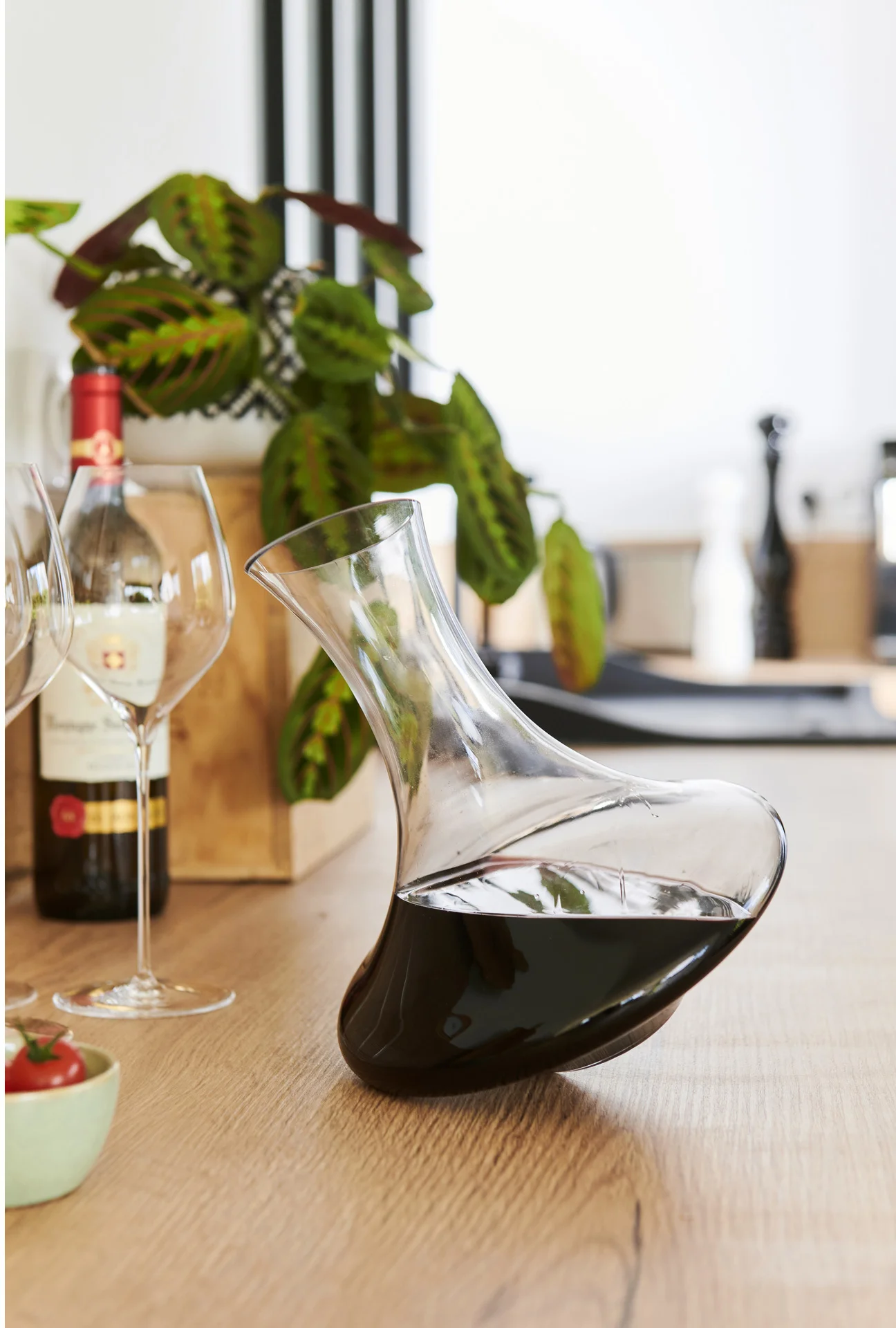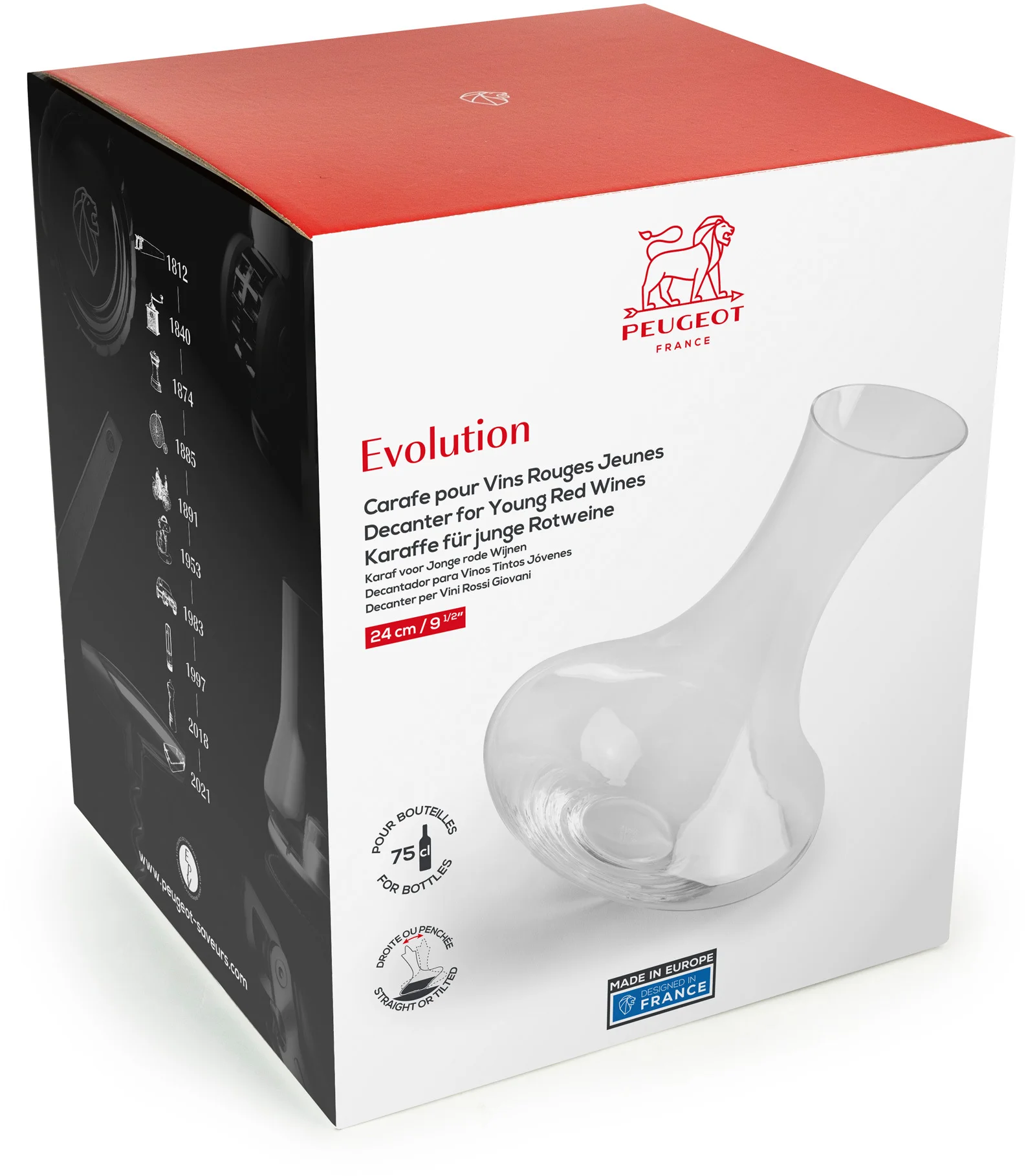 Dekanter EVOLUTION to oryginalna propozycja od marki Peugeot dla miłośników młodych win czerwonych. Łączy w sobie estetykę, pomysłowość i efektowność. Piękny, nietuzinkowy kształt i bardzo szeroka podstawa, zapewnia maksymalne napowietrzenie wina. Wlewając wino do dekantera, rozprowadza się ono po obszernych ściankach naczynia, tym samym dotlenia się uwalniając jego najlepsze aromaty. Nietuzinkowy kształt podstawy pozwala na ustawienie go w dwóch pozycjach: prostej lub pochylonej. Pochylona pozycja ułatwia obracanie wina w karafce. Falisty kształt podstawy sprzyja mieszaniu się molekuł młodych czerwonych win.