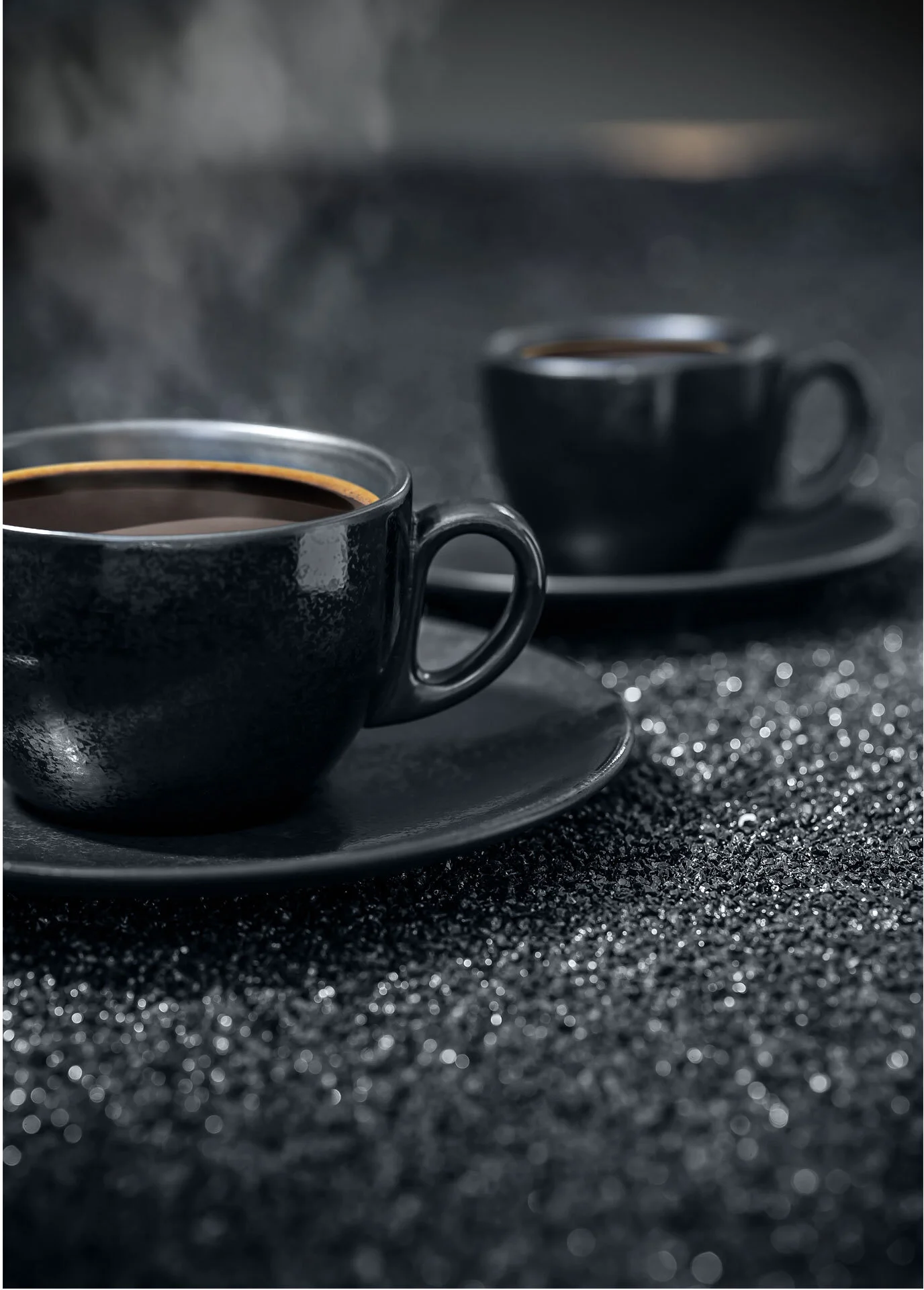 Linia KARBON nawiązuje do wyobrażeń o powstaniu świata, kiedy czarna materia zroszona kryształkami i pyłem węgielnym, wypełniała nicość. Matowa glazura, mieniąca się szklistym pyłem, inspirowana jest strukturą naturalnego węgla kamiennego. Łagodne, minimalistyczne formy talerzy i naczyń są idealnym tłem dla głębokiej czerni szkliwa.