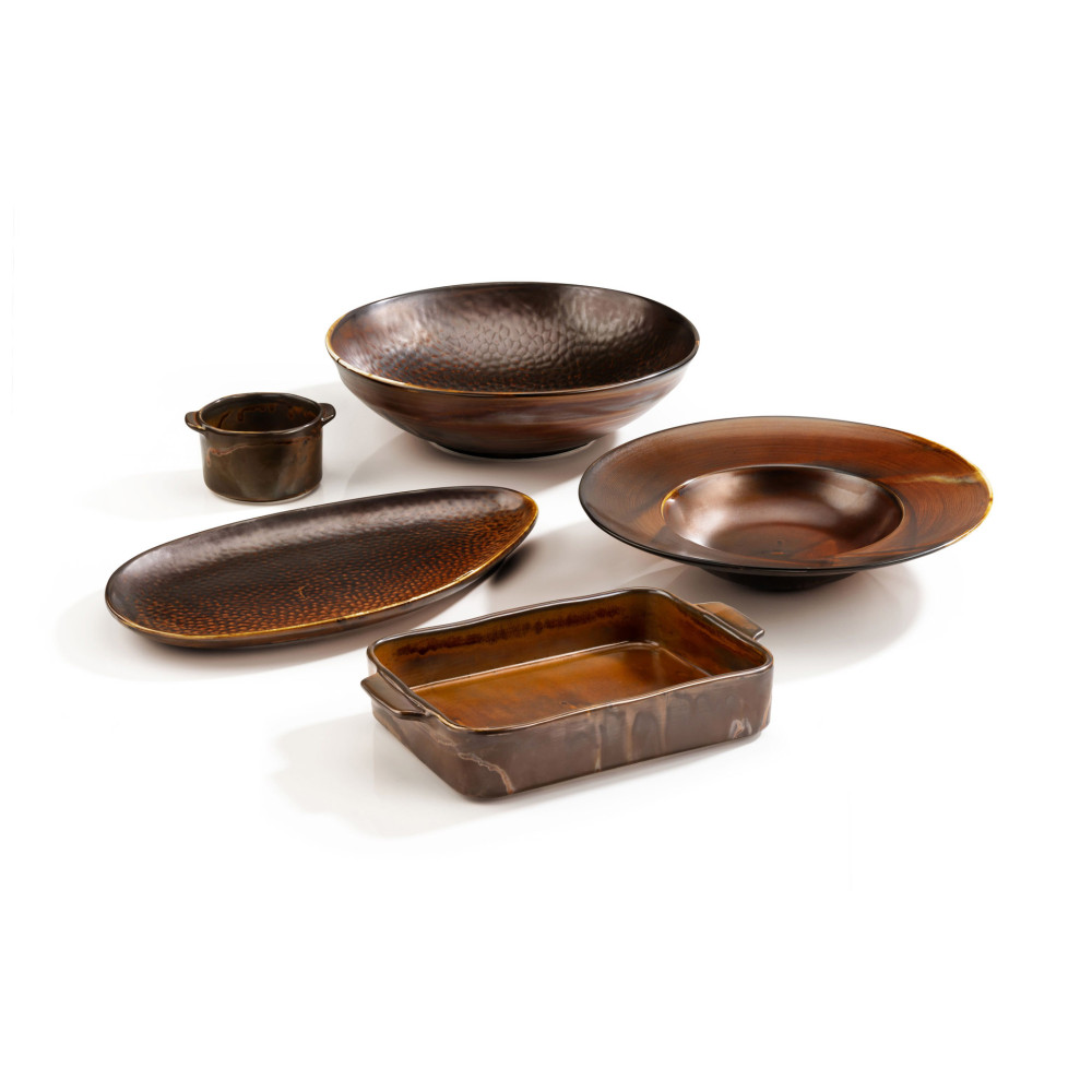 Umiejętne zastosowanie barw i innych komponentów podczas nakładania i wypalania szkliwa reaktywnego powoduje, że naczynia z tej kolekcji mają podobny charakter i doskonale się uzupełniają. Osiągnięty efekt, do złudzenia przypomina naczynia wyprodukowane przez rzemieślnika. Tworzymy w ten sposób unikalne kompozycje, które są ozdobą stołów w nowocześnie urządzonych mieszkaniach i restauracjach.