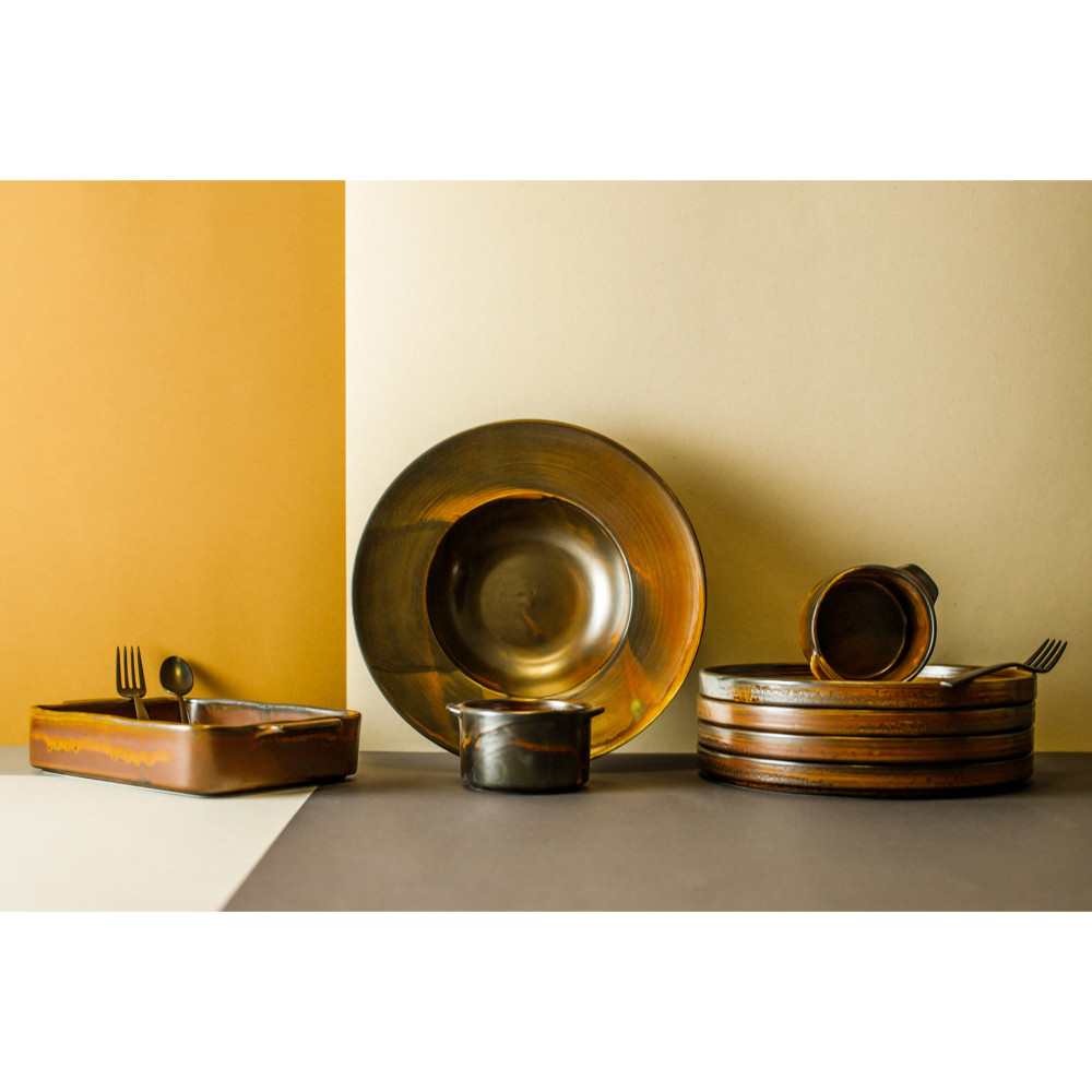 Kolekcja FIRE to aż dziesięć różnych propozycji naczyń, które stworzą wyjątkowe wrażenie na Twoim stole. Połączenie miedzianego-szlachetnego koloru oraz ciekawej, młotkowanej struktury porcelany to obecnie bardzo mocny trend w wyposażeniu restauracji czy jadalni. Kolekcja inspirowana starzeniem się brązu, nierównomierna faktura oraz subtelne refleksy uzyskane dzięki nowatorskiej metodzie wypalania porcelany, to idealne tło do wyeksponowania serwowania dań. Połączenie kolekcji FIRE z elementami linii DEEP BLUE to wyjątkowo kreatywna propozycja dla osób poszukujących nietuzinkowych naczyń. Mieszanie się barw postarzanej miedzi z mocnym, niezwykle modnym kobaltowym granatem kolekcji DEEP BLUE doskonale odnajdą się zarówno w odważnych, nowoczesnych wnętrzach, jak i tych z nutą ekstrawagancji. Świetnym uzupełnieniem do takiego zestawu będą sztućce VERLO DESTELLO COPPER oraz szkło VERVINO marki Schott Zwiesel. Oczaruj swych gości topową zastawą i wyjątkową aranżacja stołu! p>Ręczne wykończenie porcelany, najwyższej jakości surowiec i charakterystyczny design, tworzą wrażenie przenikania się klasyki z nowoczesnością. Wszystkie linie porcelany Verlo zostały stworzone również z myślą o profesjonalnej gastronomii, są wytrzymałe i odporne na wyszczerbienia. Rozmaitość form, struktur i kolorów będzie wspaniałym tłem dla kreatywności miłośnika kuchni.
