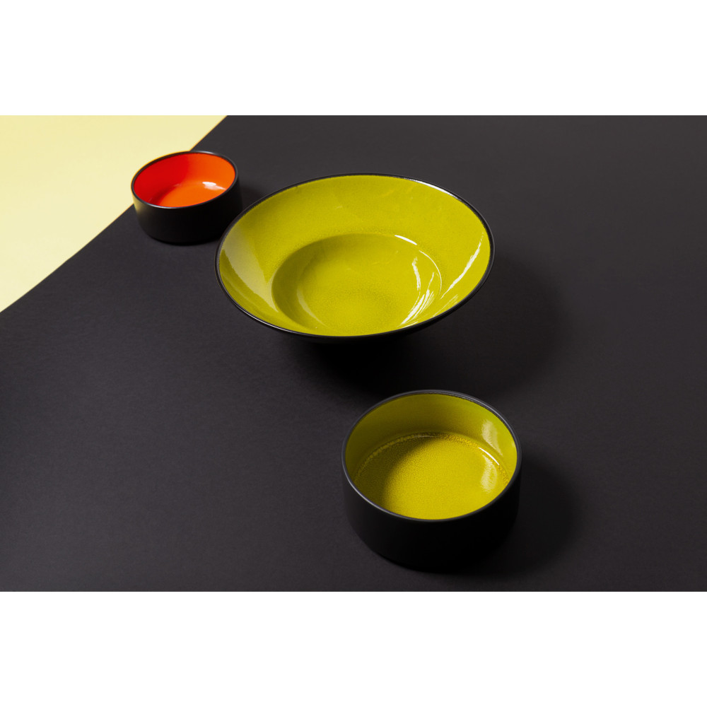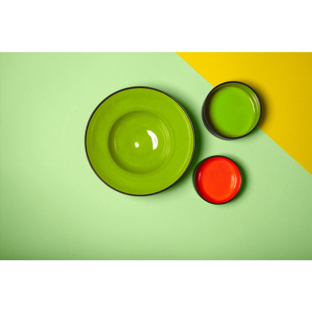 FIRE to ekstrawagancka linia porcelany, którą wyrózniają żywe, dynamiczne kolory. Ręcznie malowane, oryginalne w swojej intensywności barwy zieleni, pomarańczu i czerwieni nadają talerzowi unikalnego charakteru. Minimalistyczna forma eksponuje elektryzujące kolory wnętrza i matową czerń zewnętrznej glazury talerza.