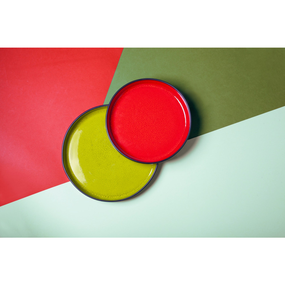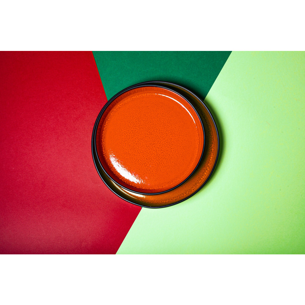 FIRE to ekstrawagancka linia porcelany, którą wyrózniają żywe, dynamiczne kolory. Ręcznie malowane, oryginalne w swojej intensywności barwy zieleni, pomarańczu i czerwieni nadają talerzowi unikalnego charakteru. Minimalistyczna forma eksponuje elektryzujące kolory wnętrza i matową czerń zewnętrznej glazury talerza.
