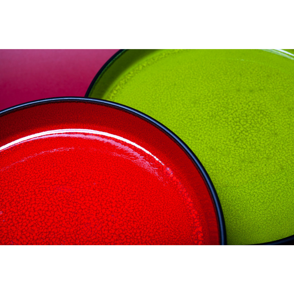 FIRE to ekstrawagancka linia porcelany, którą wyrózniają żywe, dynamiczne kolory. Ręcznie malowane, oryginalne w swojej intensywności barwy zieleni, pomarańczu i czerwieni nadają talerzowi unikalnego charakteru. Minimalistyczna forma eksponuje elektryzujące kolory wnętrza i matową czerń zewnętrznej glazury talerza.
