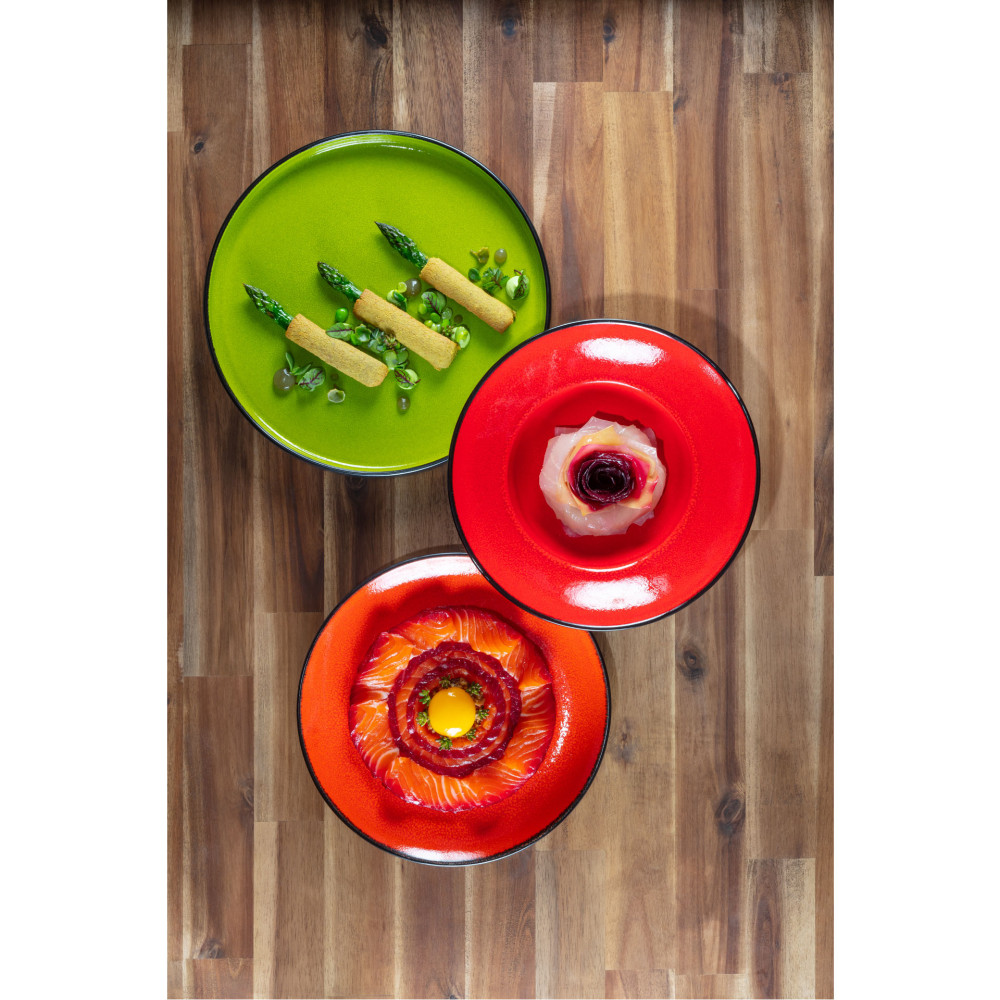 FIRE to ekstrawagancka linia porcelany, którą wyrózniają żywe, dynamiczne kolory. Ręcznie malowane, oryginalne w swojej intensywności barwy zieleni, pomarańczu i czerwieni nadają talerzowi unikalnego charakteru. Minimalistyczna forma eksponuje elektryzujące kolory wnętrza i matową czerń zewnętrznej glazury talerza.