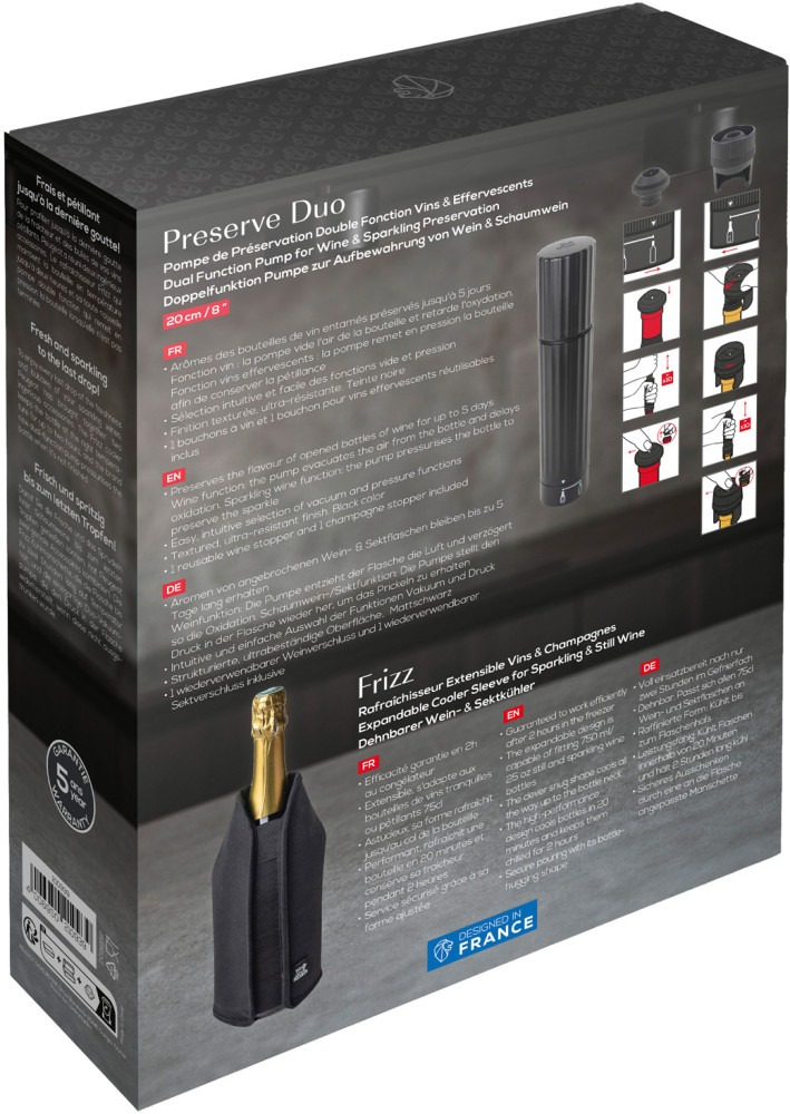 Zestaw prezentowy Fresh'n Preserve zawiera elektryczną pompkę próżniową, cooler oraz dwa korki próżniowe do wina i szampana. Całość zapakowana jest w eleganckie pudełko, co czyni ten zestaw idealnym prezentem.