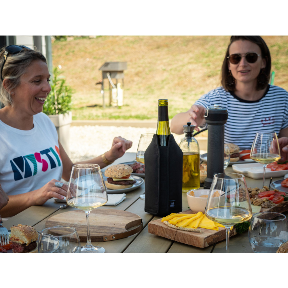 Cooler Frizz skutecznie schłodzi butelki wina i szampana o pojemności 750 ml. Dzięki elastycznemu ściągaczowi i wyprofilowanej formie dopasowuje się do rozmiaru i kształtu butelki, tym samy skutecznie chłodzi ją nawet przy samej szyjce. Wystarczy 20 minut, aby obniżyć temperaturę wina z 20°C do 9°C. Cooler utrzymuje wino w optymalnej temperaturze nawet do 2 godzin. Przed użyciem należy przechowywać cooler w zamrażalce. Ze względu na zawartość specjalnego żelu chłodzącego, najlepsza wydajność osiągana jest po 2 godzinach zmrażania. Niezależnie od tego czy serwujesz wino w pomieszczeniu, czy na zewnątrz, Frizz będzie przydatnym akcesorium podczas domowych imprez lub przyjęć plenerowych w ciepłe, letnie dni.