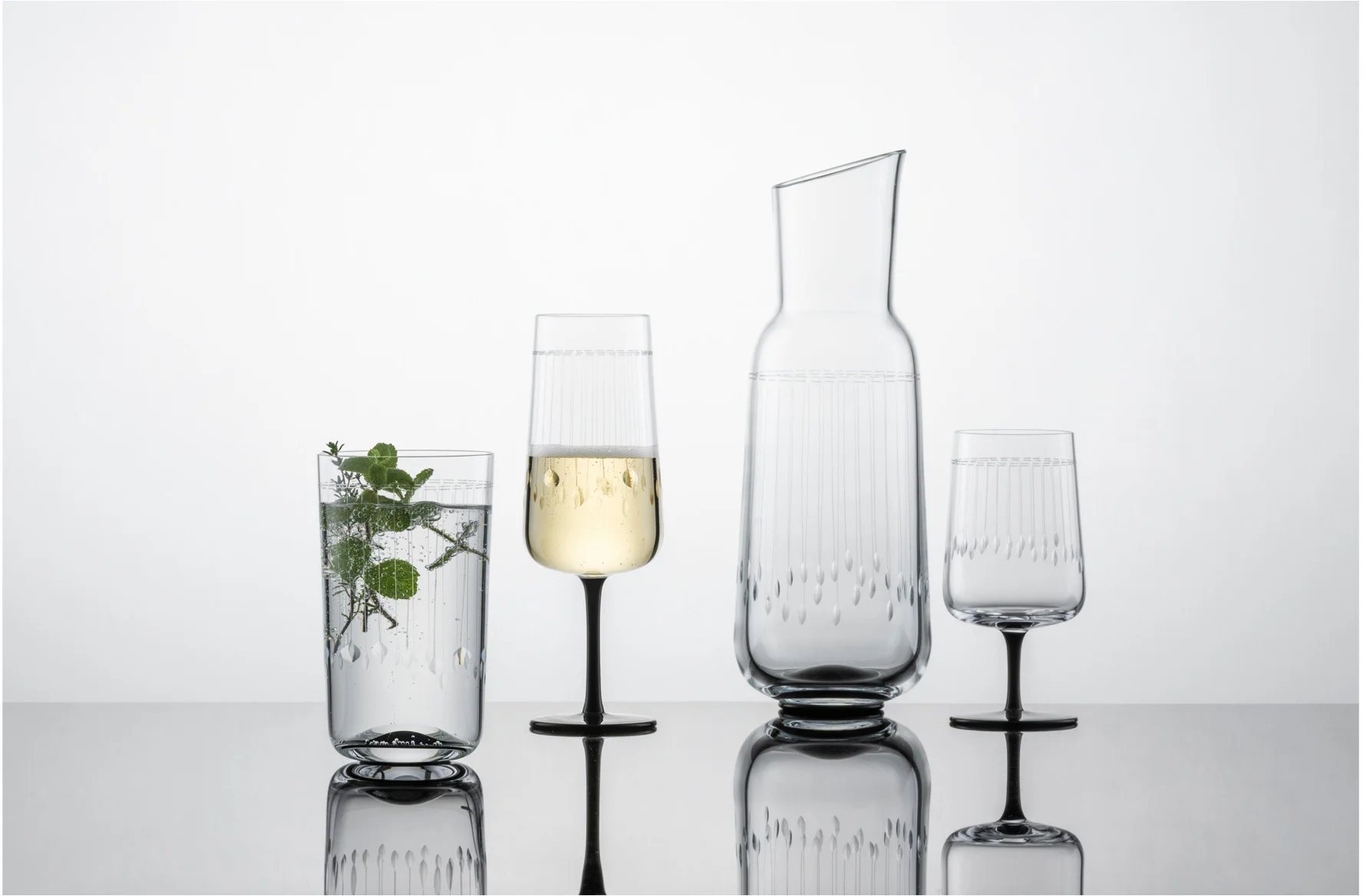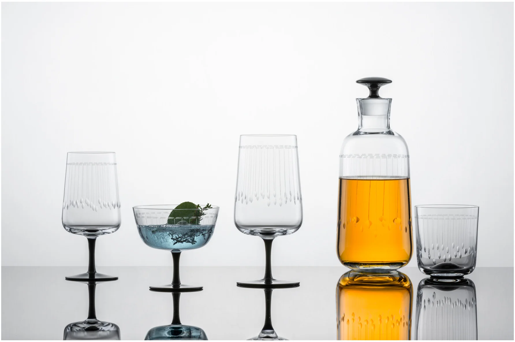 Mistrzowskie wykonanie, charakterystyczne żłobienie i piękne połączenie koloru czarnej nóżki i kryształowego szkła sprawia, że ta ręcznie wykonana kolekcja jest idealnym wyborem na specjalne okazje. Swym charakterem nawiązuje do lat 20. XX wieku i designu Art Déco.