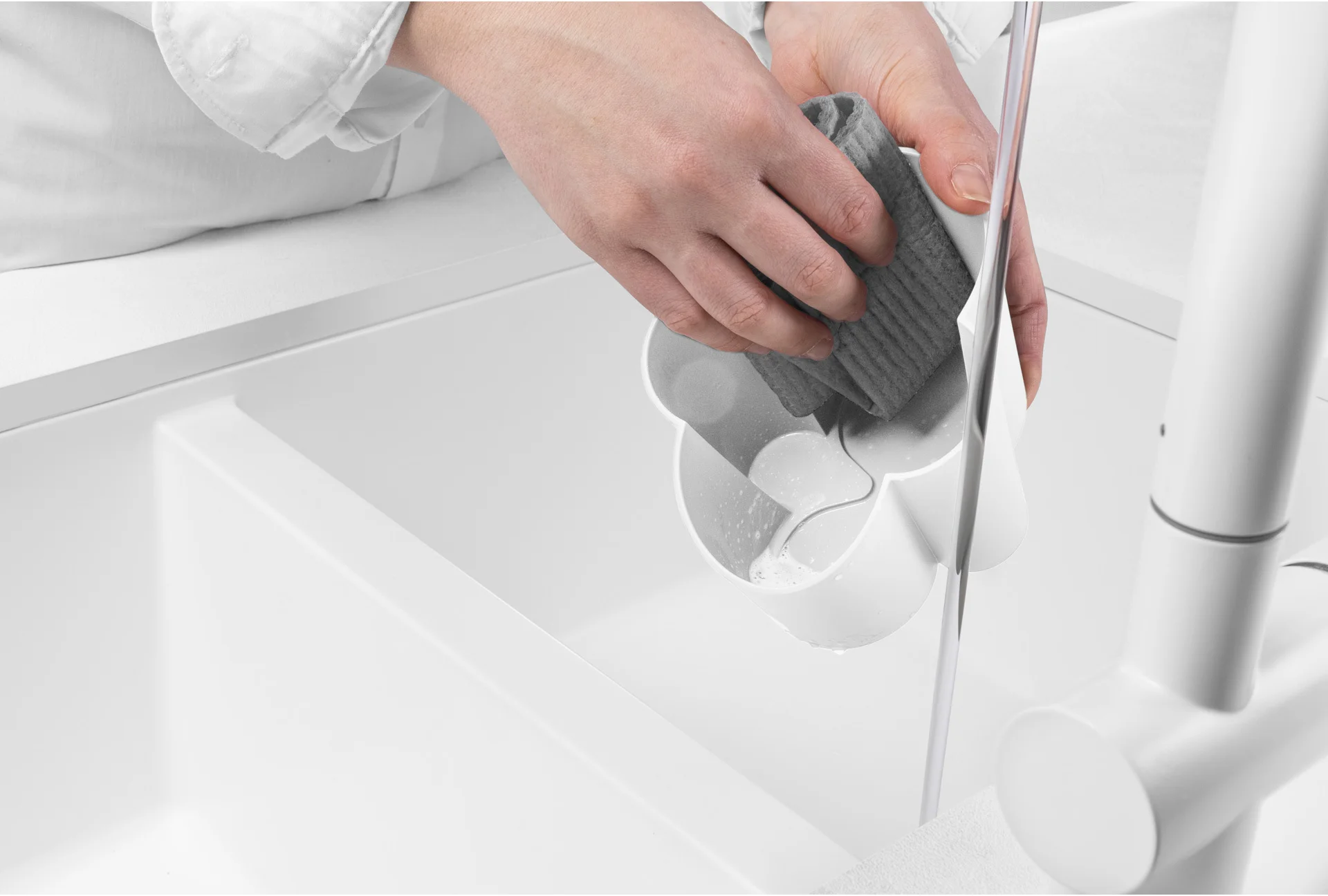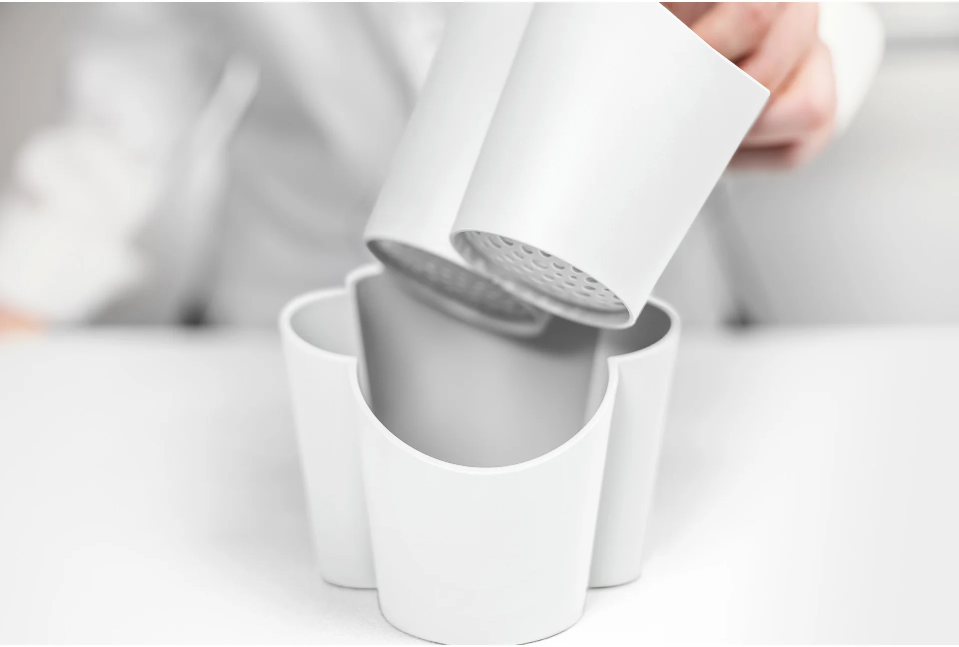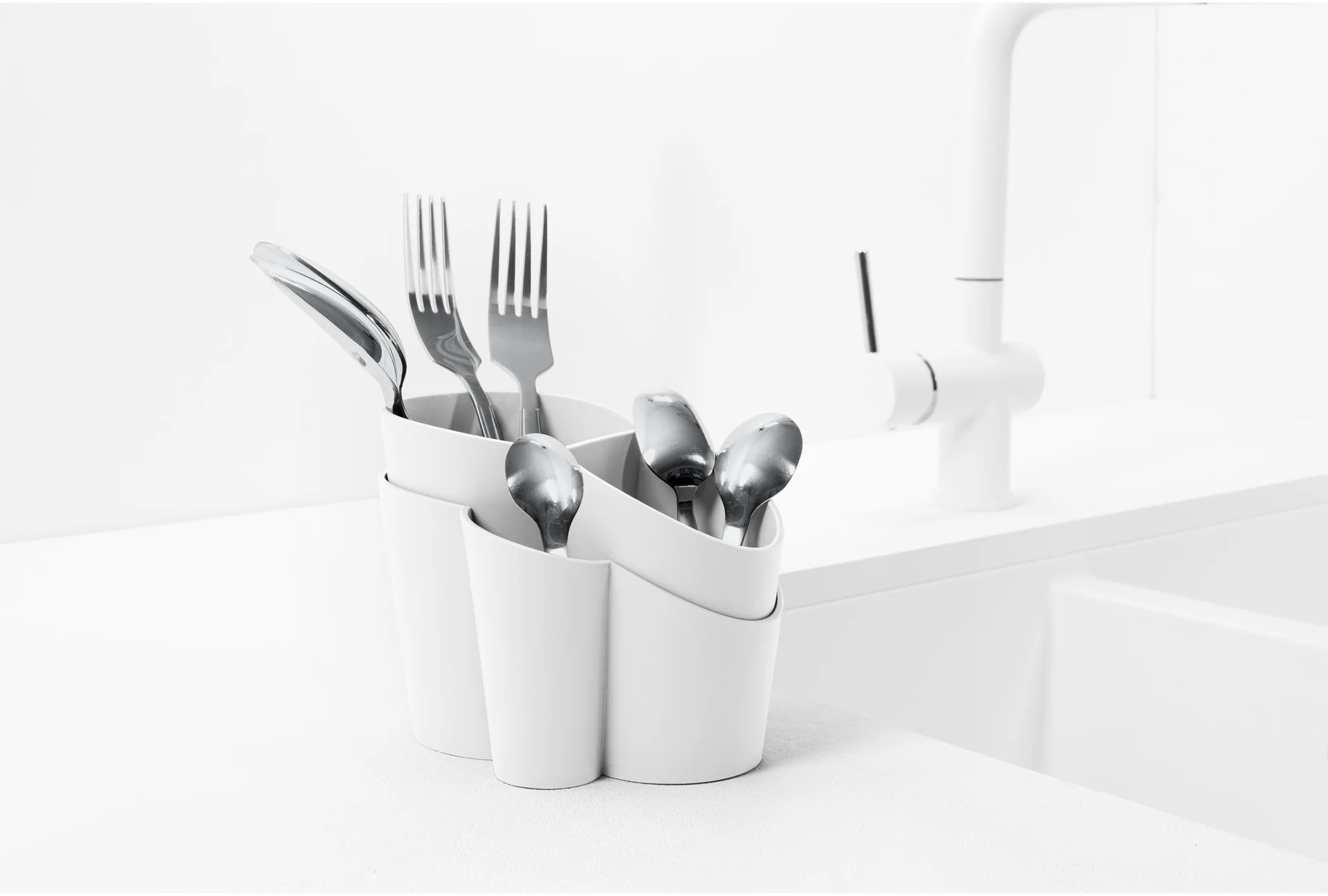 Pojemnik na sztućce z ociekaczem GOCCIOLO podzielony został na cztery części o różnej wysokości, ułatwiając tym samym segregację i wyciąganie zróżnicowanych sztućców. Nadmiar wody ścieka poprzez otwory umieszczone w wierzchniej części pojemnika. Wyjmując tą część można łatwo pozbyć się wody z podstawy pojemnika.