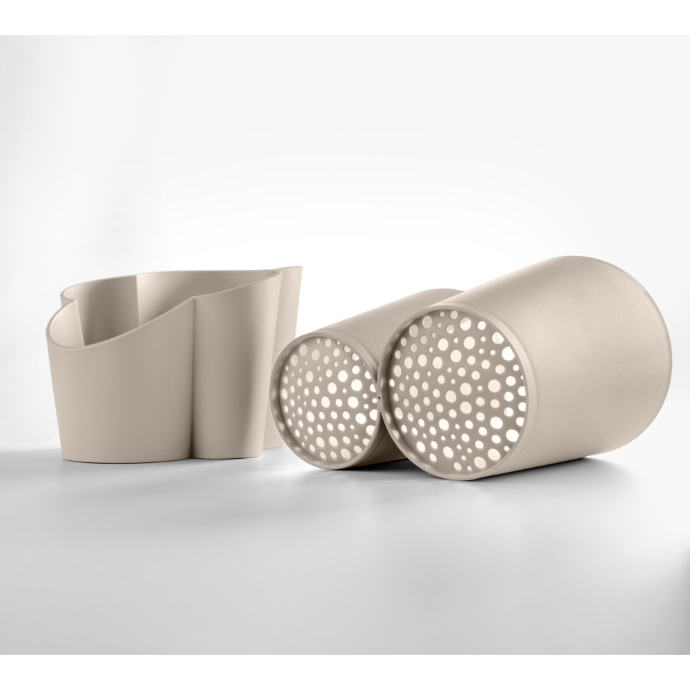 Pojemnik na sztućce z ociekaczem GOCCIOLO podzielony został na cztery części o różnej wysokości, ułatwiając tym samym segregację i wyciąganie zróżnicowanych sztućców. Nadmiar wody ścieka poprzez otwory umieszczone w wierzchniej części pojemnika. Wyjmując tą część można łatwo pozbyć się wody z podstawy pojemnika.
