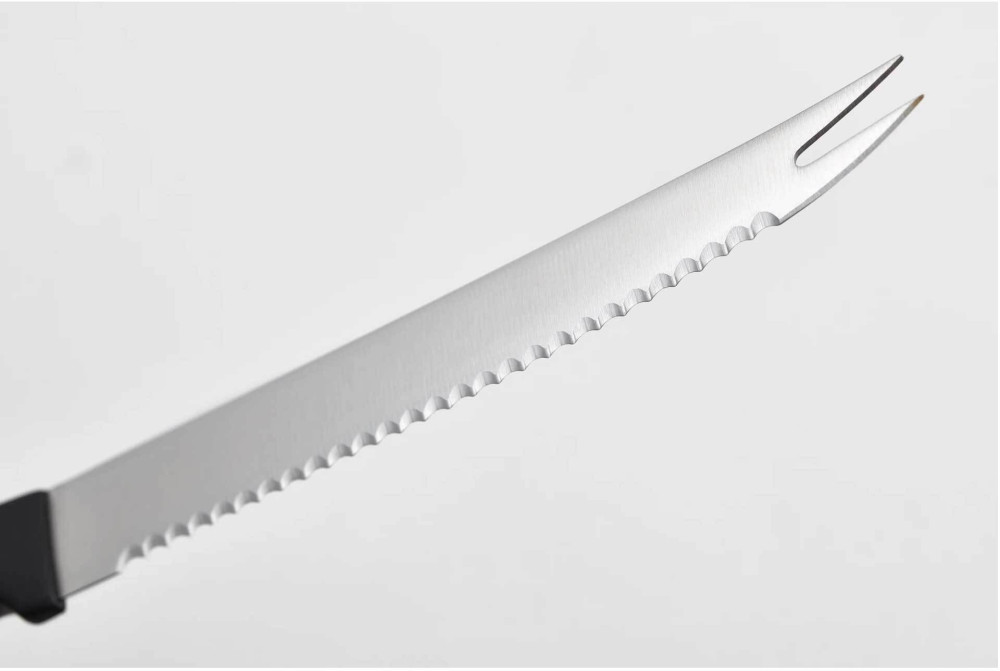 Nóż o ząbkowanym ostrzu pokroi nawet najbardziej dojrzałe pomidory w idealnie cienkie plasterki. Specjalnie wyprofilowana końcówka noża jest doskonałym narzędziem do serwowania pokrojonych plasterków czy cząstek.
