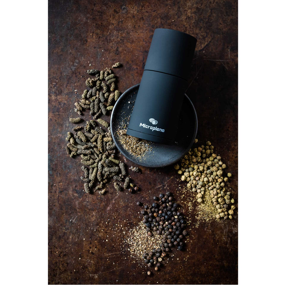 Młynek Microplane zapewnia doskonałe rezultaty mielenia twardych przypraw, również takich, które nie mogą być mielone w tradycyjnych młynkach. Młynek Microplane z powodzeniem zmieli gałkę muszkatołową, korę cynamonu, orzechy, fasolę tonka, długi pieprz, czy ulubioną mieszankę rodzajów pieprzu. Niezwykle precyzyjne ostrze umieszczone jest w podstawie młynka. Młynek jest łatwy w użyciu. Wystarczy zdjąć górną część, umieść przyprawy, następnie nałożyć górną część, docisnąć i przekręcać zgodnie z kierunkiem wskazówek zegara. Przyprawy mogą być przechowywane bezpośrednio w młynku – szczelny dozownik chroni przyprawy przed utratą aromatu i zapachu. Silikonowa osłonka podstawy młynka, pozwala zachować czystość, kiedy młynek nie jest używany – przyprawy nie wydostają się z podstawy młynka, zaśmiecając blat czy stół.