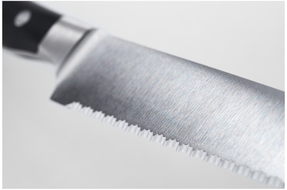 Precyzyjna, podwójnie ząbkowana krawędź noża do chleba WÜSTHOF sprawia znaczną różnicę w stosunku do standardowego noża do chleba: w przeciwieństwie do jednokrotnie ząbkowanej krawędzi, ten nóż posiada podwójne ząbki, co oznacza, że pozostaje ostry dłużej, wymaga mniejszego nacisku i nadaje się do bardzo precyzyjnych cięć. Chleb o twardej skórce nie jest miażdżony podczas krojenia, natomiast chleb o miękkiej skórce jest również precyzyjnie krojony, bez rozrywania delikatnej powierzchni pieczywa.