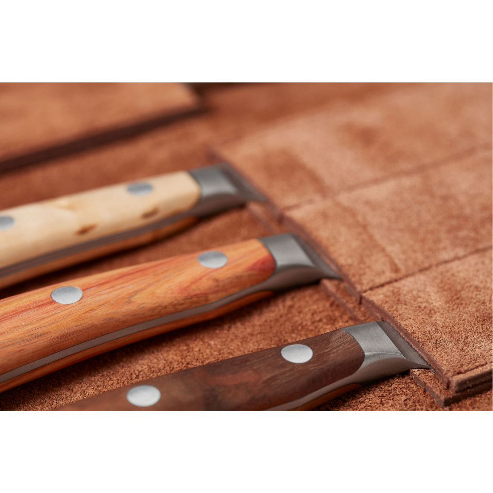 Zestaw 6 noży stekowch IKON w torbie skórzanej łączy w sobie design i precyzję. Zestaw zawiera sześć kultowych noży do steków 12 cm. Każdy nóż ma pięknie usłojoną rękojeść wykonaną z unikalnych gatunków drewna: afrykańskiego drewna jesionowego, orzecha amerykańskiego, bocote z Ameryki Łacińskiej, kanadyjskiego klonu Birdseye, skandynawskiej brzozy i brazylijskiego tulipanowca. Ręcznie wykonane skórzane etui z naturalnej toskańskiej skóry bydlęcej to designerskie i jakościowe rozwiązanie dla przechowywania zestawu noży stekowych.