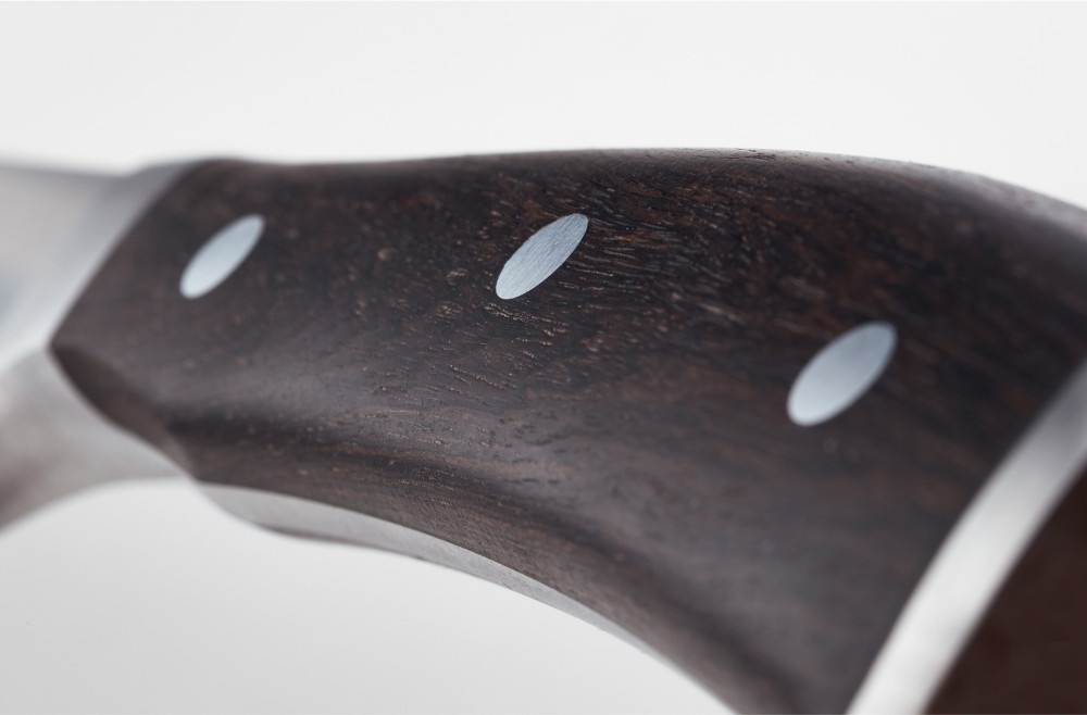 Potrójnie nitowana rękojeść wykonana jest ze specjalnie wyselekcjonowanej odmiany afrykańskiego czarnego drzewa Grenadill, uchodzącego za jedno z najtwardszych na świecie. Rysunek każdego kawałka drewna jest niepowtarzalny i taki staje się każdy z egzemplarzy noża IKON. Ponadto dzięki wodoodporności i walorom higienicznym świetnie nadaje się do zastosowań kuchennych.