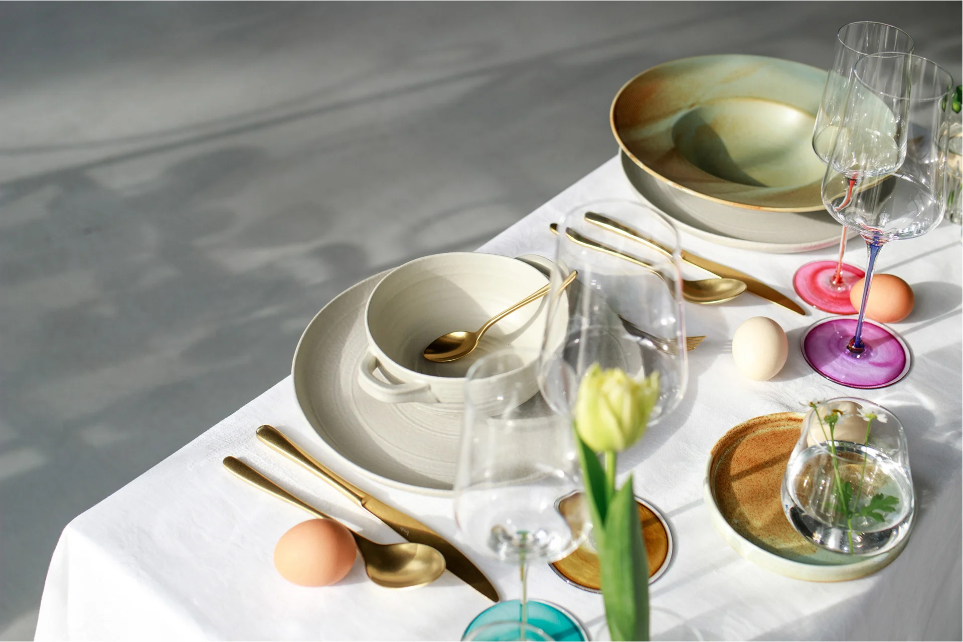 Kolekcja INK to połączenie klasyki z wyrafinowanym designem. Piękna, klasyczna czasza kieliszków, osadzona na barwionej podstawie i nóżce, są wyraźnym nawiązaniem do stylu lat 70-tych. W misternym procesie produkcji opartym na tradycyjnych technikach rzemieślniczych w podstawach kieliszków powstają piękne gradienty kolorów przypominające akwarele. Wybarwienie szkła w nóżce kieliszka jest niezwykle subtelne – wybarwiona została tylko jej wewnętrzna część. Kolorowa „nić” wewnątrz nóżki oraz mocniejsze wybarwienie podstawy daje niezwykły efekt wizualny.