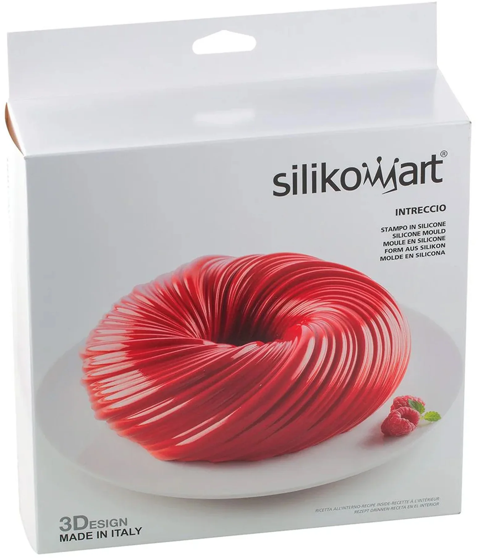 Forma Intreccio z linii 3Design firmy Silikomart gwarantuje ona doskonałe rezultaty nie tylko w wersji semifreddo i mousse, ale także w wersji do wypiekania. Innowacyjna technologia 3D marki Silikomart sprawia, że wyjmowanie deserów z formy jest szybkie i łatwe, co pozwala osiągnąć perfekcyjne efekty. Może być wykorzystywana do przygotowywania różnych rodzajów deserów, w tym ciast i wielu innych. Kształt formy nawiązuje do wieńca o fakturze splecionych nitek, co daje zaskakujący i oryginalny efekt w tworzeniu kreatywnych deserów.