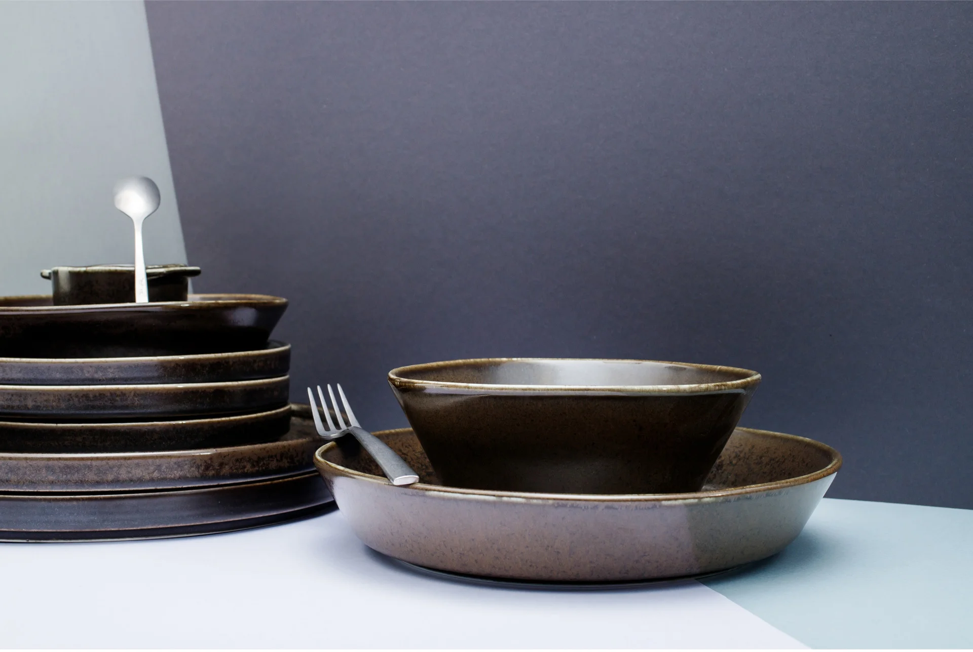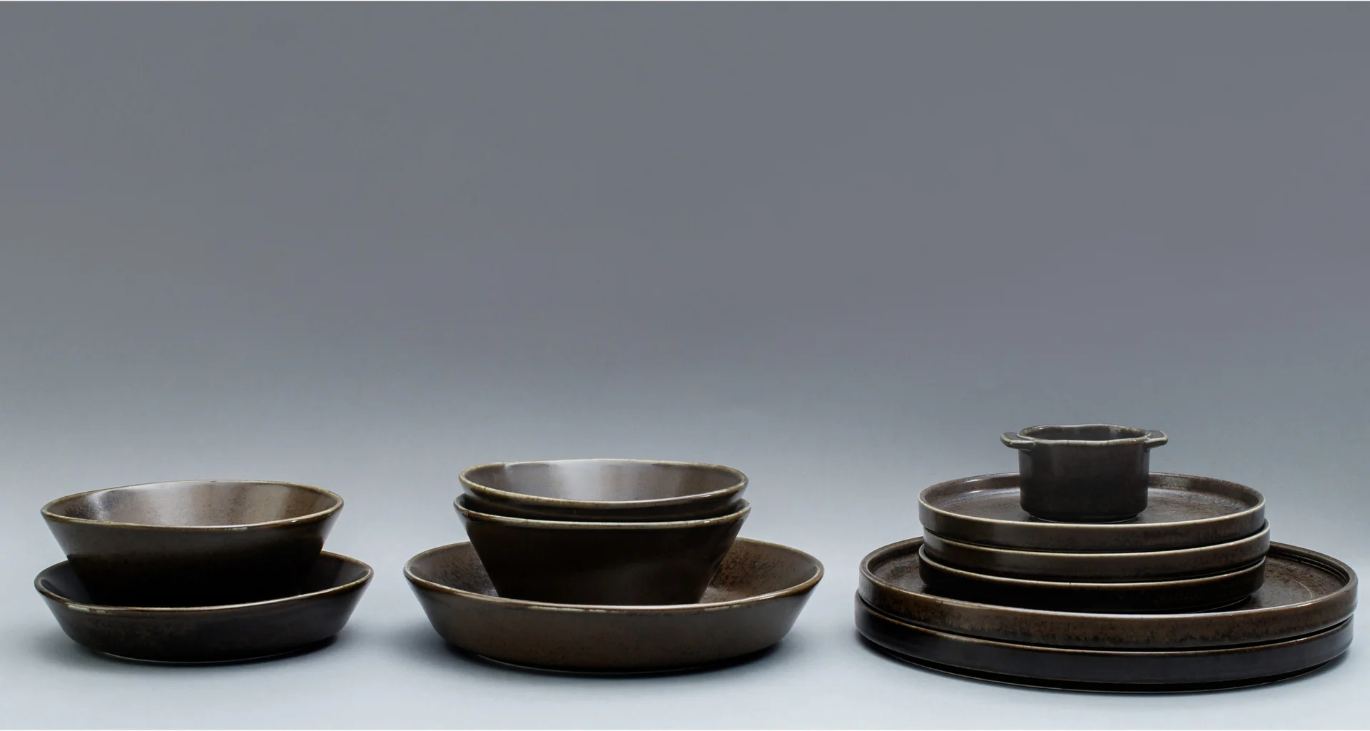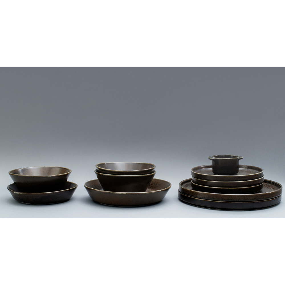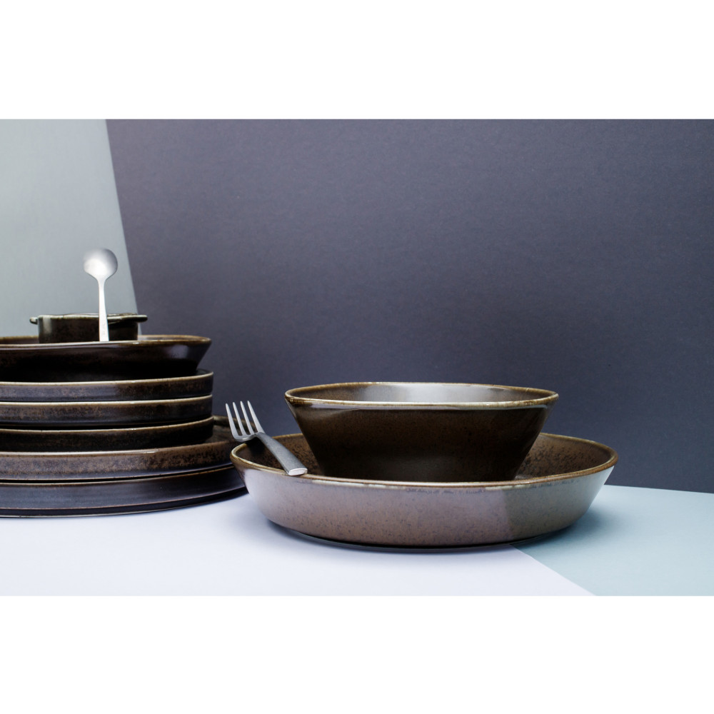 Inspiracją w tworzeniu tej kolekcji było rzemieślnicze wytwarzanie naczyń i odniesienie do jej naturalnych walorów. Ciężka, solidna forma tych naczyń oraz ciemna kolorystyka pięknie skomponuje się zarówno w minimalistycznej aranżacji kuchni czy jadali, jak również w bardziej rustykalnych wnętrzach. Subtelne, półmatowe wykończenie naczyń wspaniale podkreśla lekko nakrapianą glazurę i przenikanie się barw.