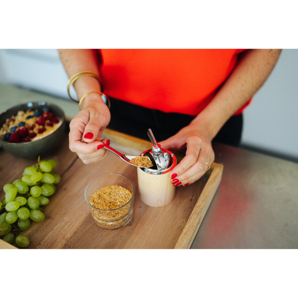 Siemię lniane jest jednym z 10 produktów spożywczych, które są najbogatszym źródłem kwasów omega 3. Doskonale sprawdza się również przy diecie bezglutenowej. Aby w pełni wykorzystać wszystkie właściwości odżywcze siemienia lnianego, należy zmielić nasiona tuż przed spożyciem. Całe nasiona lnu bardzo dobrze przechowują się, jednak przetrzymywanie ich w mielonej formie przez dłuższy czas w kontakcie z powietrzem, temperaturą otoczenia i światłem spowoduje, że będą jełczeć. Dlatego aby w pełni cieszyć się bogactwem omega 3, użyj manualnego młynka Naka, z opatentowanym mechanizmem zaprojektowanym specjalnie do mielenia nasion lnu i sezamu. Mechanizm mielący dostosowany jest do konsystencji i twardości ziaren lnu. Nie nagrzewa się, zatem jest neutralny dla nasion i ich wartości odżywczej. Mechanizm można całkowicie wyjąć z obudowy w celu szybkiego i łatwego czyszczenia. Młynek łatwo się napełnia. Praktyczna przysłona zabezpiecza przed wypadaniem ziaren lnu w trakcie mielenia. Do młynka dołączona jest łyżeczka ze stali nierdzewnej do odmierzania równowartości 5 gramów nasion lnu (zalecana ilość/dzień 5-10 g) oraz szczoteczka do czyszczenia mechanizmu.