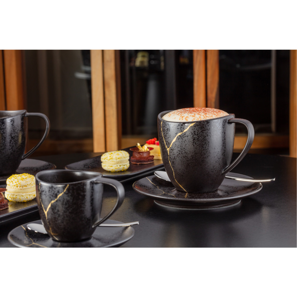 Linia KINTZOO to nawiązanie do japońskiej tradycji naprawy ceramiki, poprzez ponowne połaczenie pękniętych elementów złotem lub srebrem. Precyzyjnie naprawiony uszczerbek nadaje porcelanie unikalności i świadczy o jej historii, a metafora śladu pęknięcia symbolizuje szacunek do wszystkiego co nas otacza.