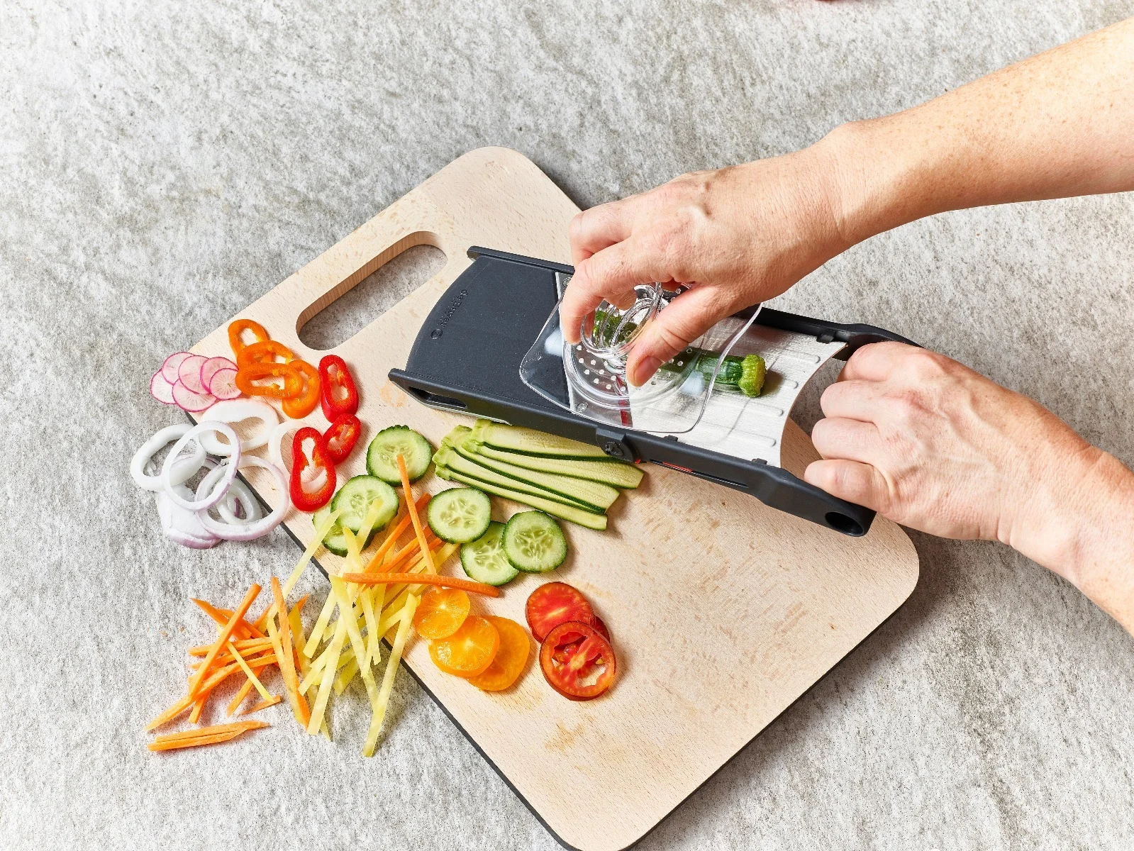 Wyposażona jest w ergonomiczny dociskać i kompaktowy pojemnik przechowujący ostrza Julienne.