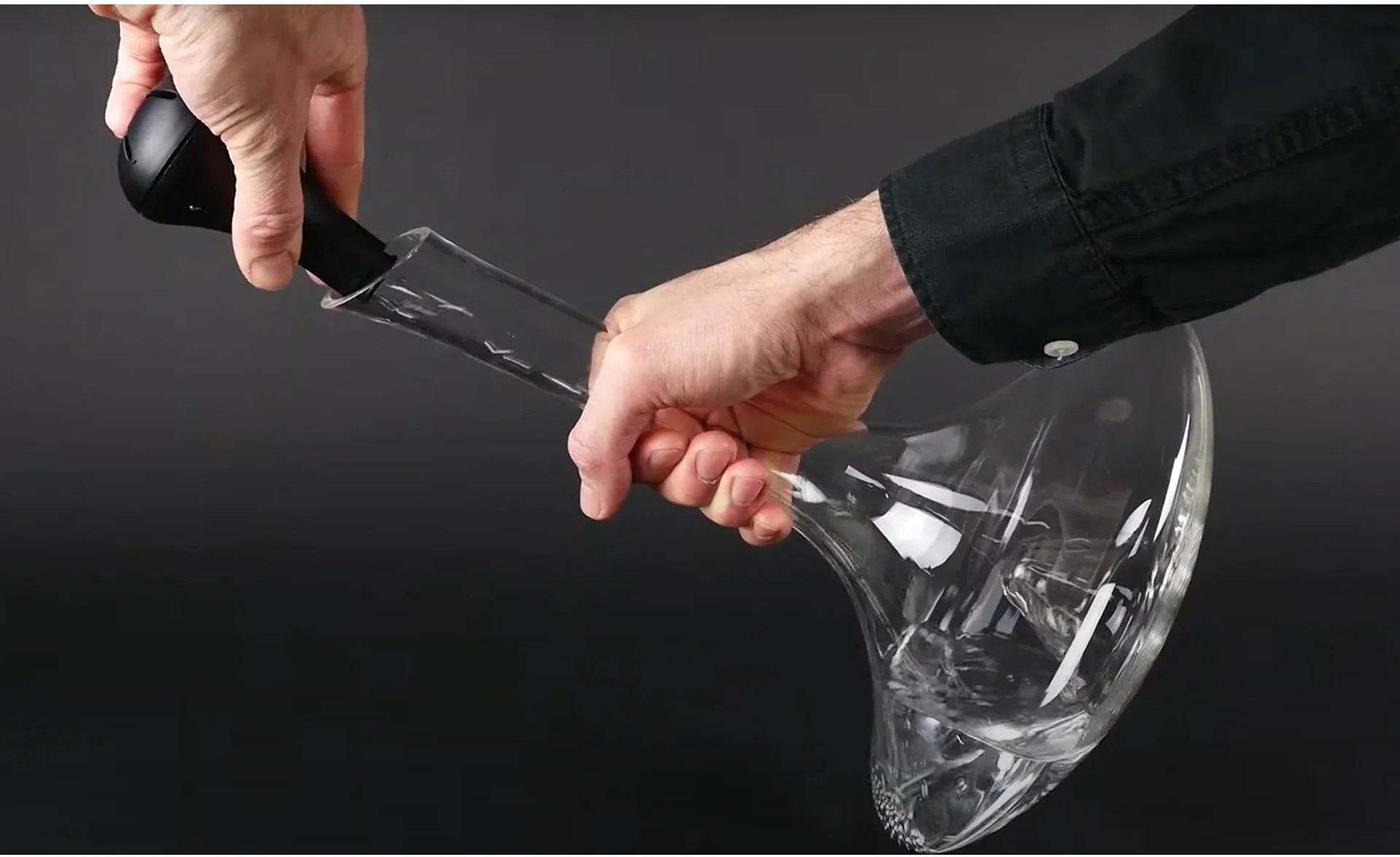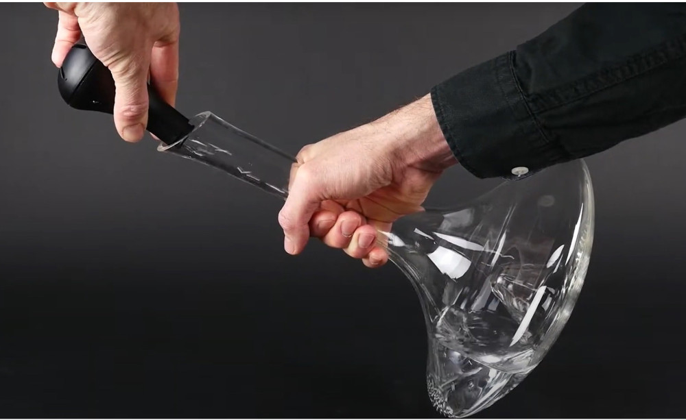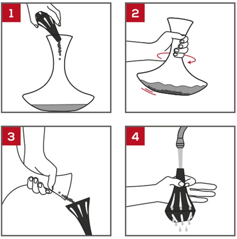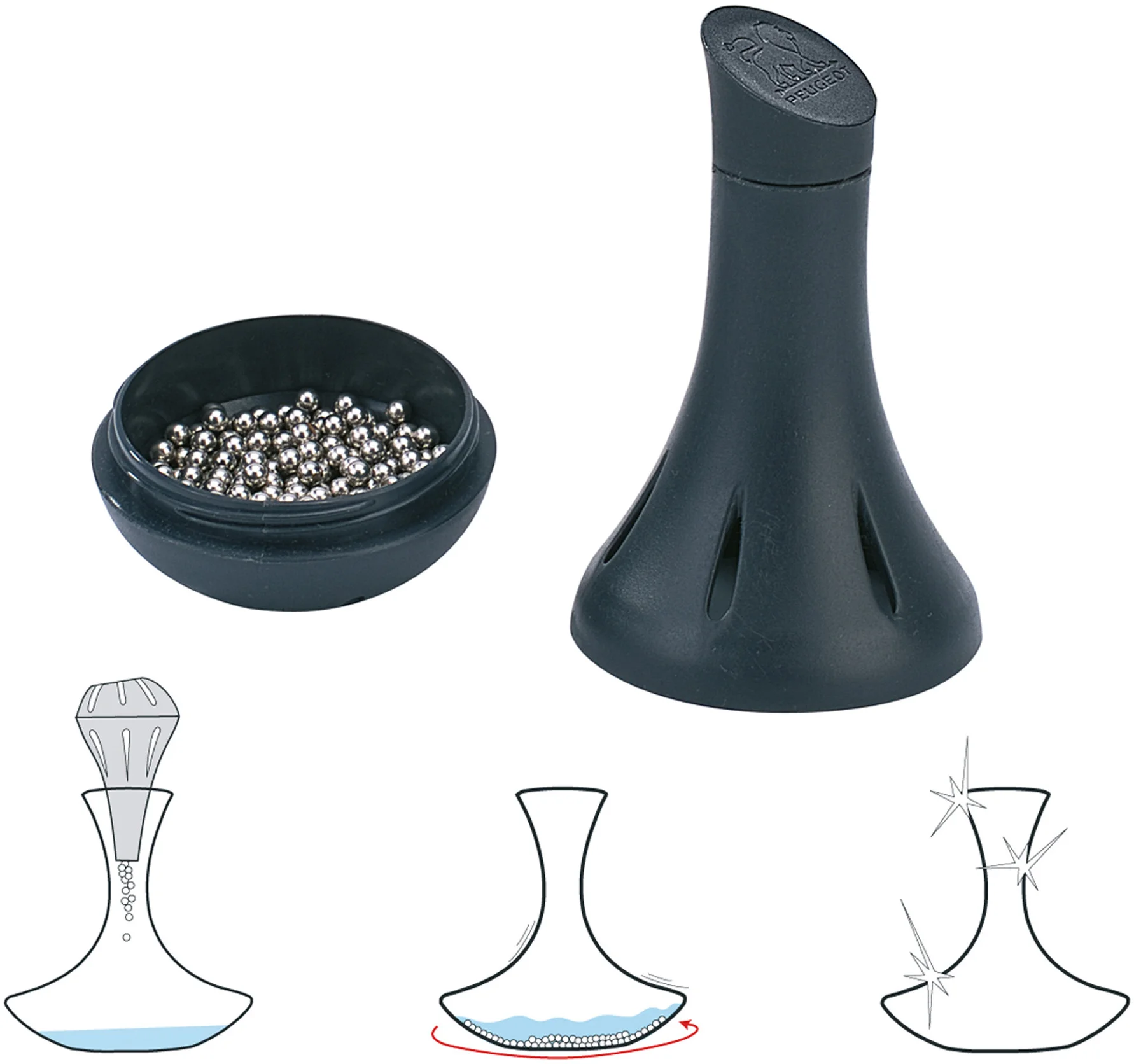 Czyszczenie dna karafki czy dekantera z osadu wina może wydawać się niełatwe. Mamy jednak na to sposób! Perełki czyszczące Peugeot Bilbo zrobią to za Ciebie. Wlej ciepłą wodę do karafki (temp.40-50°C, do wysokości ½ dna karafki), wsyp stalowe kuleczki i delikatnie obracaj karafką. Okrężny ruch wprowadza kuleczki w wir, co powoduje czyszczenie dna i wewnętrznych ścianek karafki/dekantera. Następnie przelej kuleczki z karafki do czarnego pojemnika. Przepłucz pod bieżącą wodą i osusz.