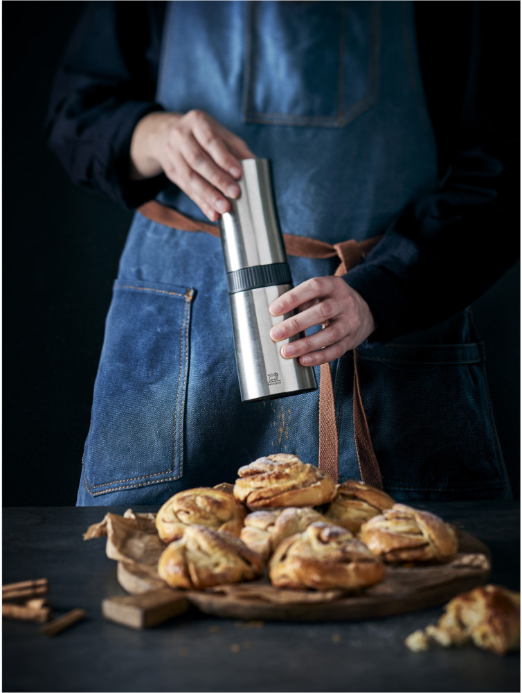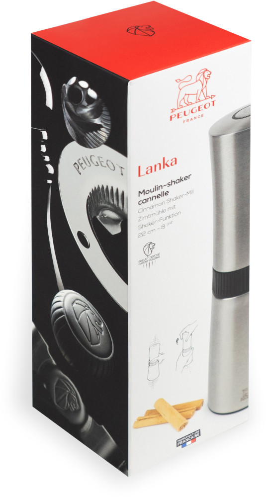 Kierując się nieustannym dążeniem marki do dostarczania miłośnikom jedzenia i entuzjastom przypraw najbardziej innowacyjnych produktów, Peugeot oferuje młynek Lenka do mielenia całych lasek cynamonu. Młynek ten łączy w sobie funkcję shakera i młynka. Odkręć górną cześć młynka, włóż jedną laskę cynamonu (max 6 cm), zamknij młynek i wstrząśnij nim kilka razy (góra-dół). Laski cynamonu zostaną rozdrobnione stalową kulką umieszczoną wewnątrz młynka. Następnie przekręć górną część młynka kilka razy aby zmielić rozdrobniony wcześniej cynamon. Świeżo mielony cynamon uwydatni i podkreśli smak twoich deserów i dań.