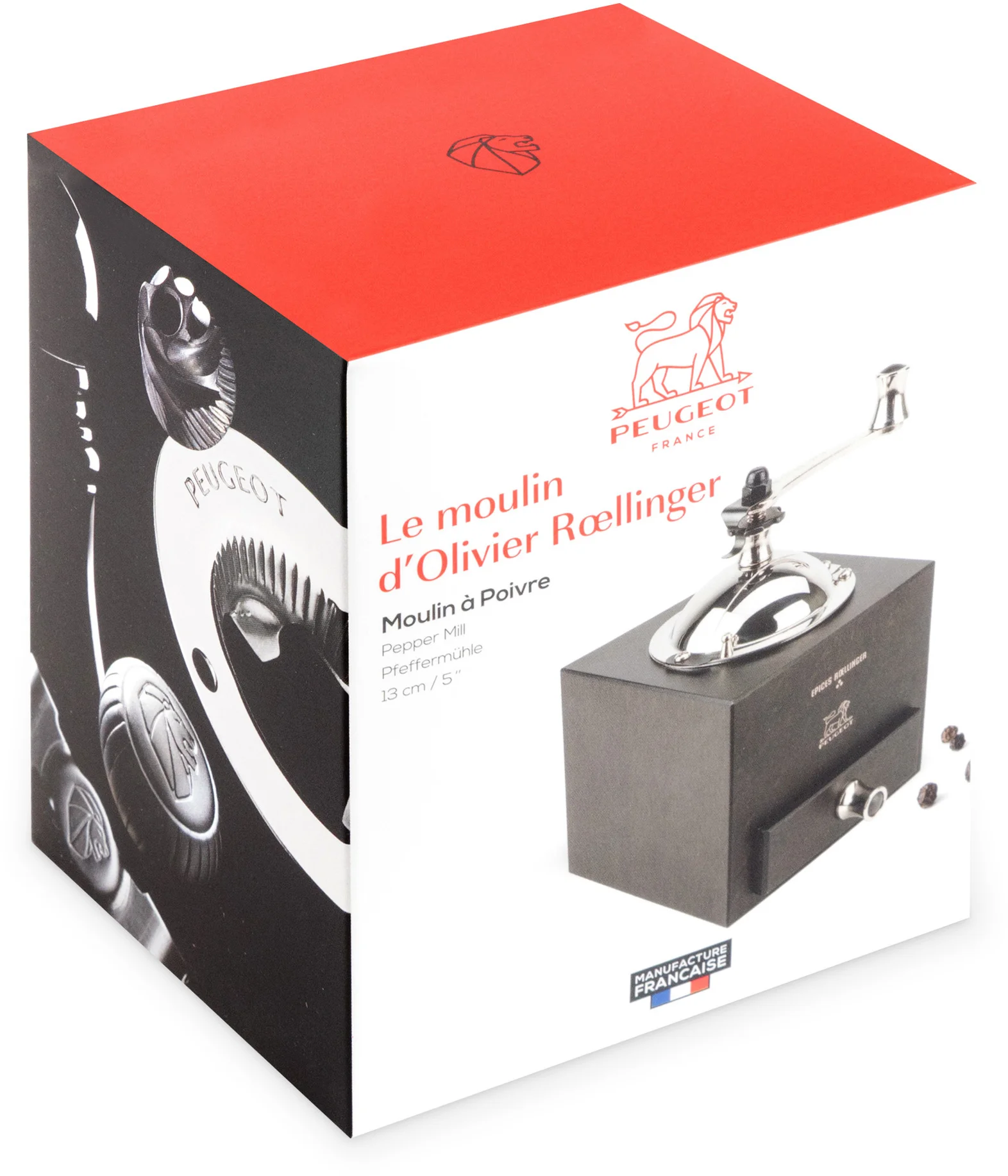 Drewniana, sześcienna obudowa wykonana z drewna bukowego, pomimo niedużych gabarytów jest niezwykle stabilna i wygodna podczas mielenia. Zamykany zbiornik na pieprz w górnej części młynka, wykonany jest ze stali nierdzewnej. Jego wykończenie w wysokim połysku nadaje młynkowi elegancji i podkreśla jego klasyczny design. Napełnianie młynka ziarnami pieprzu jest niezwykle łatwe, a zasuwka zabezpiecza przed wypadaniem ziaren podczas ich mielenia. Stalowa korbka służąca do napędzania młynka jest w doskonałych proporcjach, a jej stalowe minimalistyczne i efektowne zakończenie sprawia, że wygodnie się ją trzyma i wprowadza w ruch. Specjalny kształt szufladki i jej wgłębienie pozwala na precyzyjne zbieranie świeżo zmielonej przyprawy. Jej otwieranie i zamykanie są niezwykle łatwe i płynne. Emblemat z symbolem lwa – znakiem firmowym marki Peugeot - nadaje całości szyku i wysublimowania. Regulacja stopnia mielenia (mniej lub bardziej drobnego pieprzu) odbywa się za pomocą pokrętła znajdującego się pod korbką.