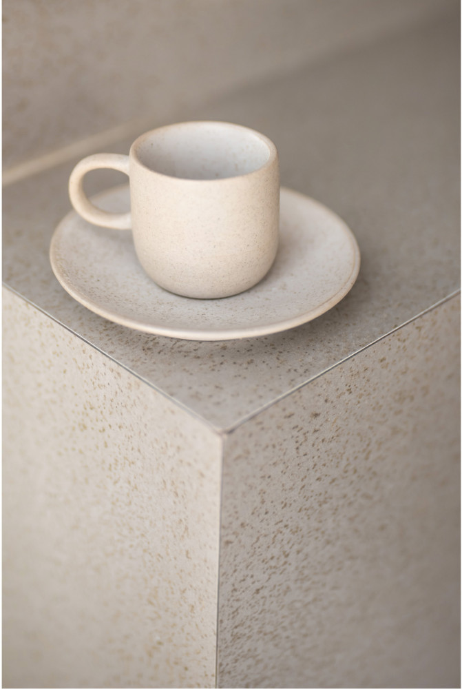 Kolorystyka porcelany LESS to piękny, naturalny kolor porcelany przypominający odcień piasku pustyni, który dodaje elegancji i harmonii każdej aranżacji stołu. Surowe, nieco szorstkie wykończenie zewnętrznej strony naczyń nadaje im wyjątkowego charakteru, podczas gdy delikatnie szkliwione wnętrze jest ozdobione subtelnie rozsypanymi drobinkami kruszcu, co nadaje im subtelny blask i elegancję.