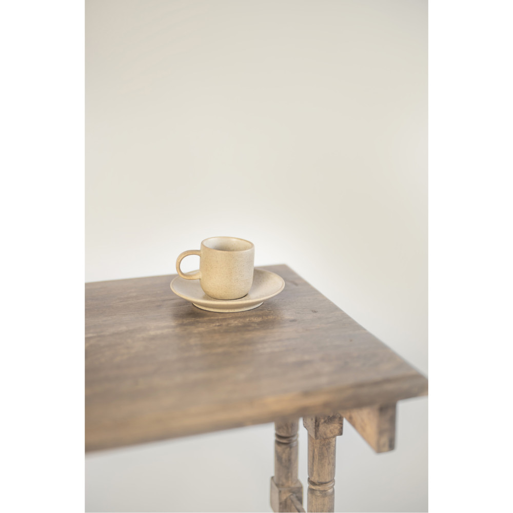 Kolorystyka porcelany LESS to piękny, naturalny kolor porcelany przypominający odcień piasku pustyni, który dodaje elegancji i harmonii każdej aranżacji stołu. Surowe, nieco szorstkie wykończenie zewnętrznej strony naczyń nadaje im wyjątkowego charakteru, podczas gdy delikatnie szkliwione wnętrze jest ozdobione subtelnie rozsypanymi drobinkami kruszcu, co nadaje im subtelny blask i elegancję.