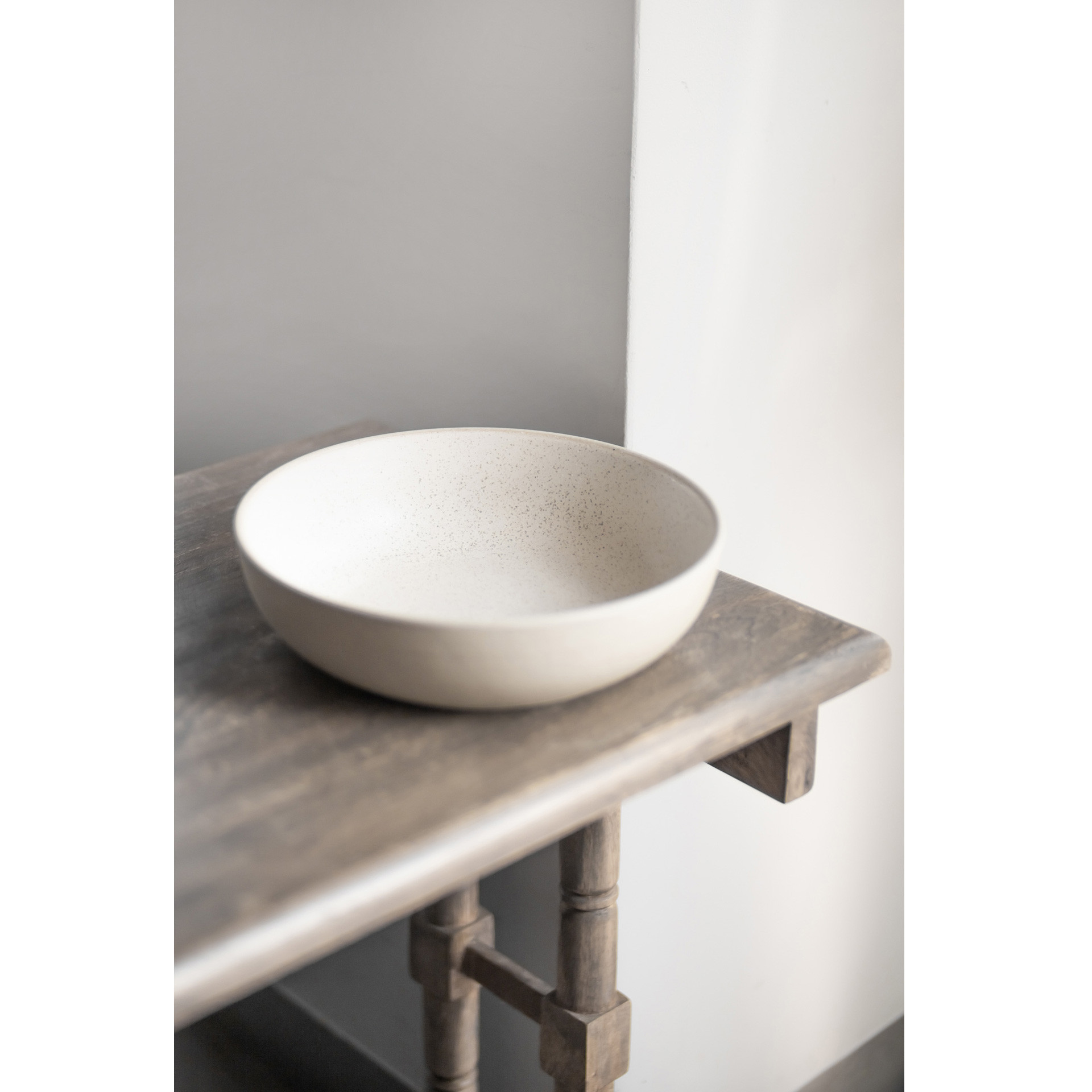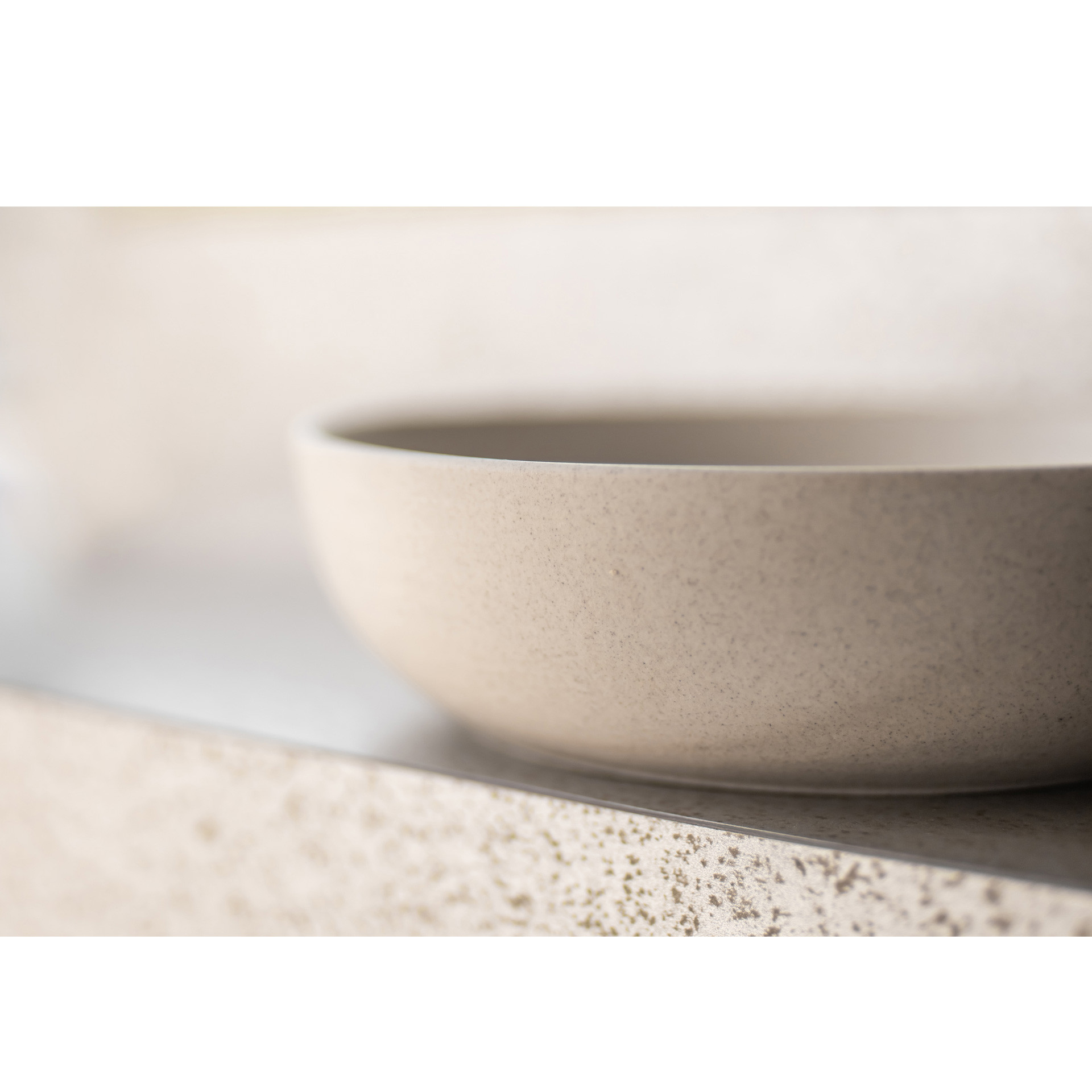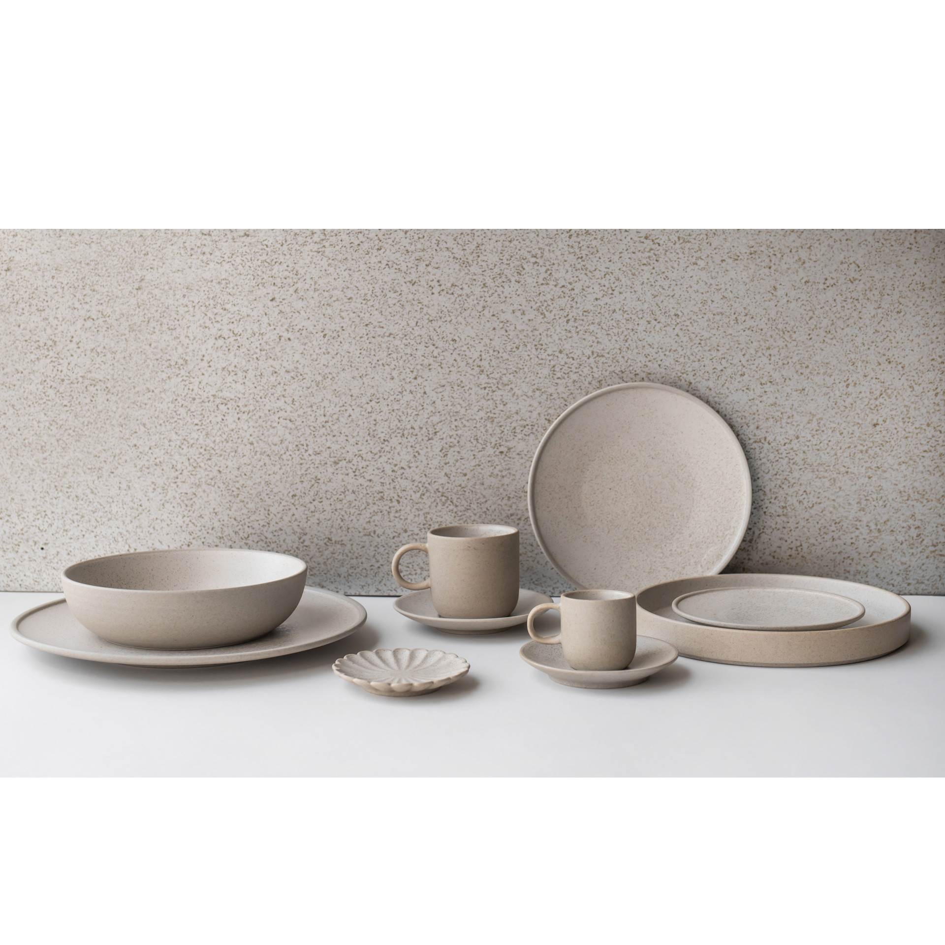 Kolorystyka porcelany LESS to piękny, naturalny kolor porcelany przypominający odcień piasku pustyni, który dodaje elegancji i harmonii każdej aranżacji stołu. Surowe, nieco szorstkie wykończenie zewnętrznej strony naczyń nadaje im wyjątkowego charakteru, podczas gdy delikatnie szkliwione wnętrze jest ozdobione subtelnie rozsypanymi drobinkami kruszcu, co nadaje im subtelny blask i elegancję.