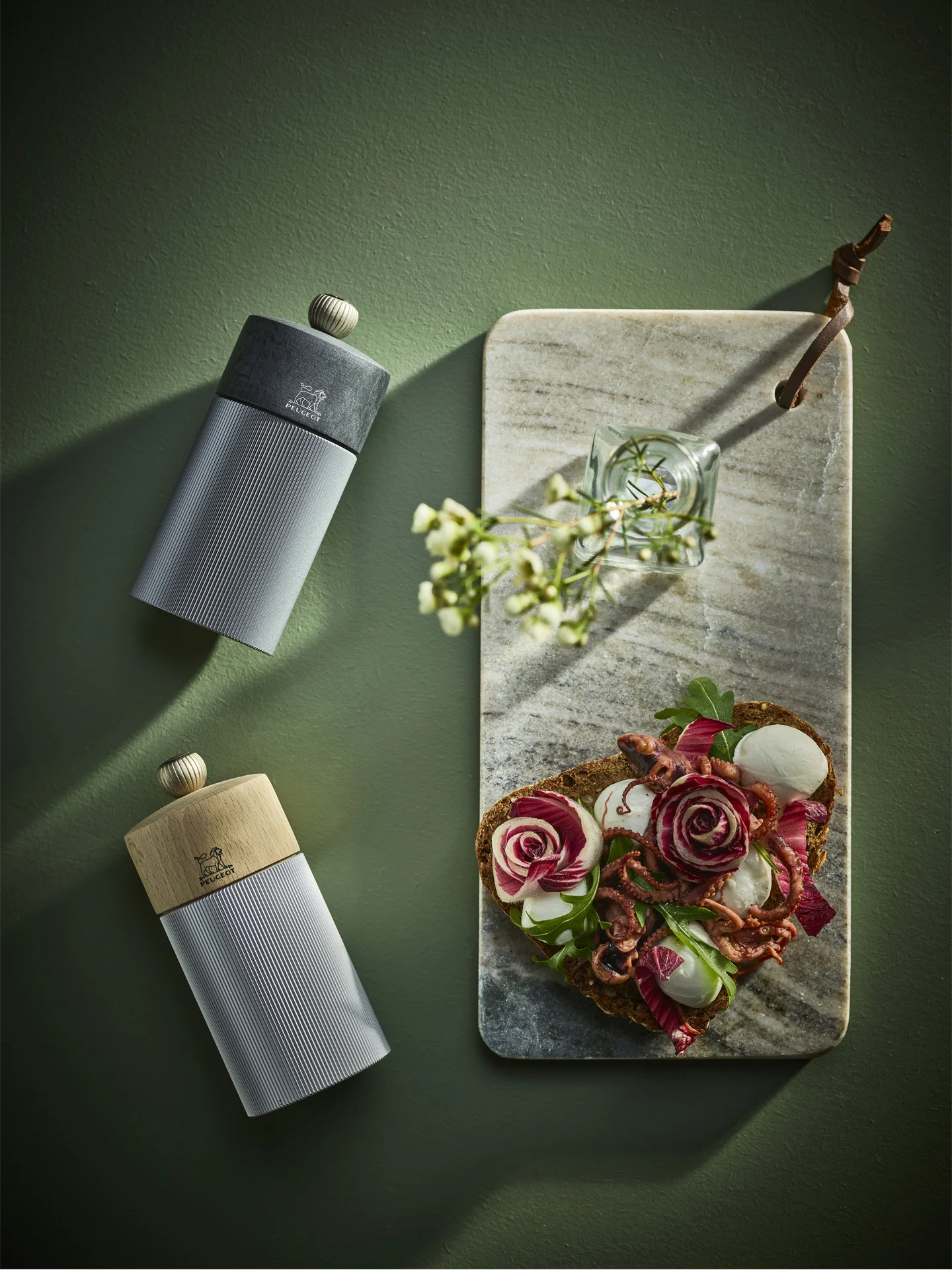 Młynki doskonale prezentuje się na stole i w kuchni. Mechanizm mielący to autorska precyzyjna konstrukcja objęta dożywotnią gwarancją. Dostosowanie grubości mielenia odbywa się poprzez dokręcenie pokrętła w górnej części korpusu. Młynki do soli i pieprzu można dowolnie komponować w ramach dostępnych wariantów Natural Aluminium i Dark Carbone.